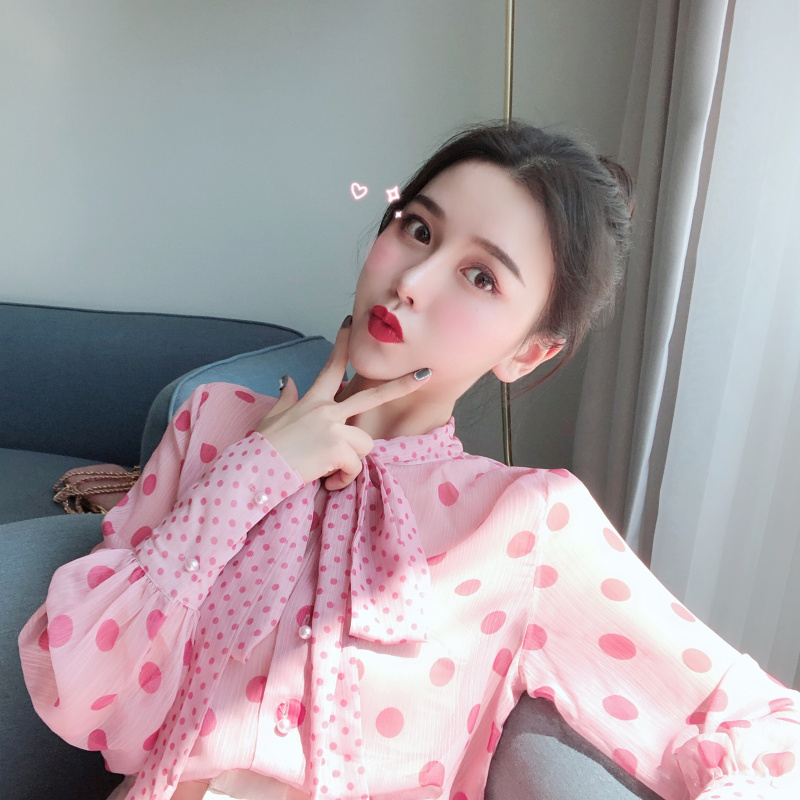 / 秋冬新款泡泡袖蝴蝶結領波點雪紡上衣高腰A字百褶半裙時尚套裝女