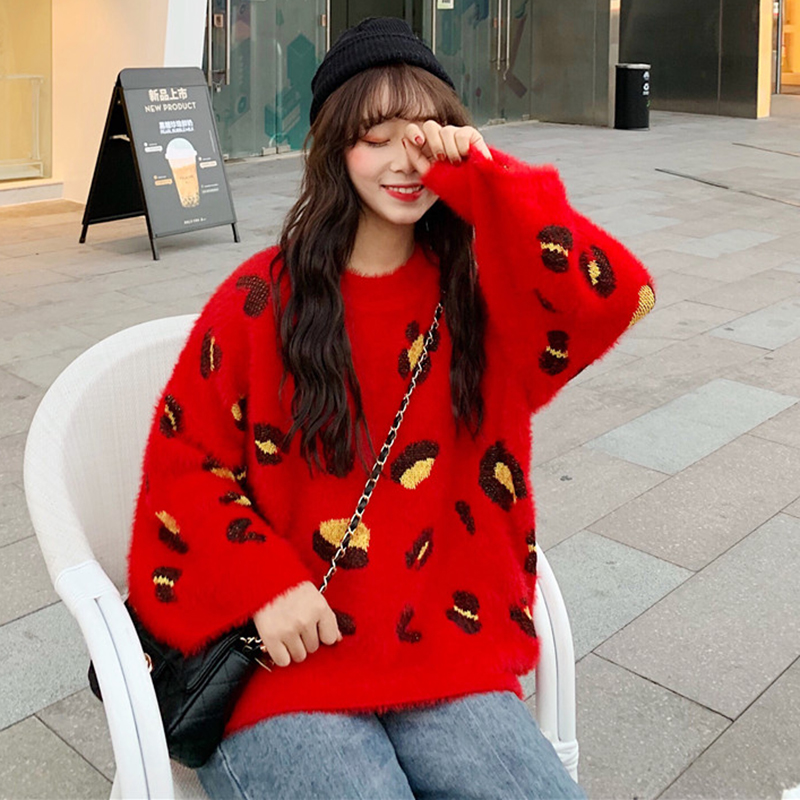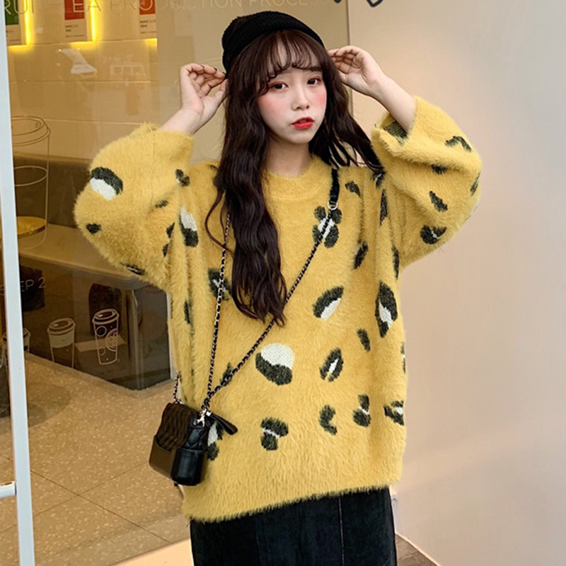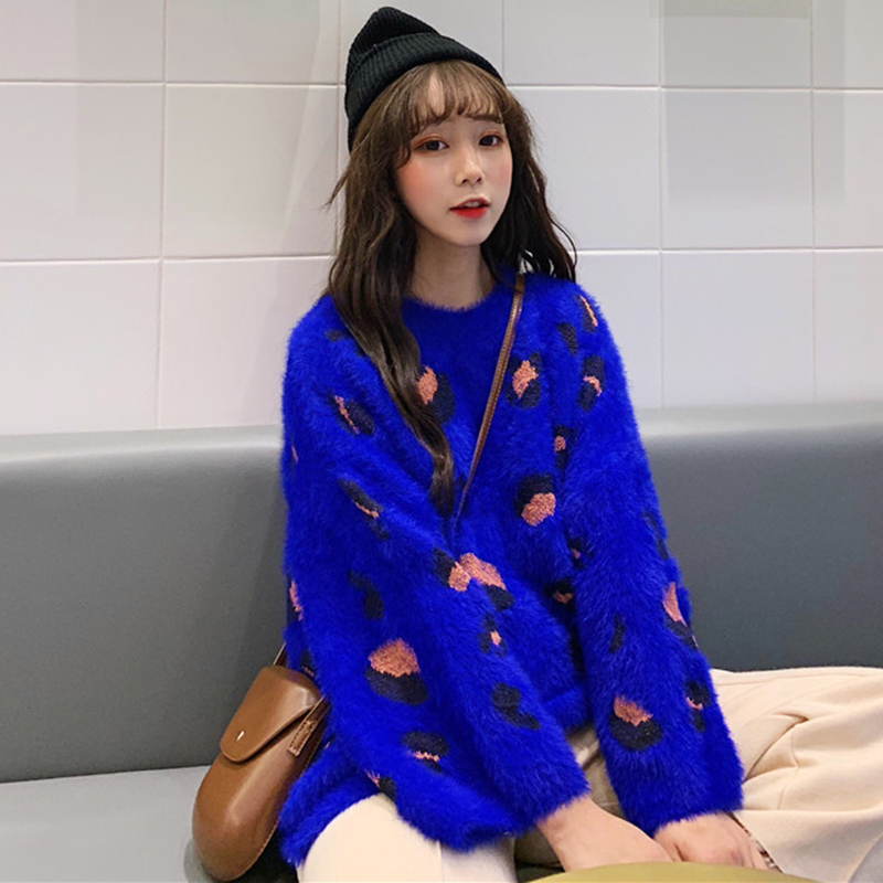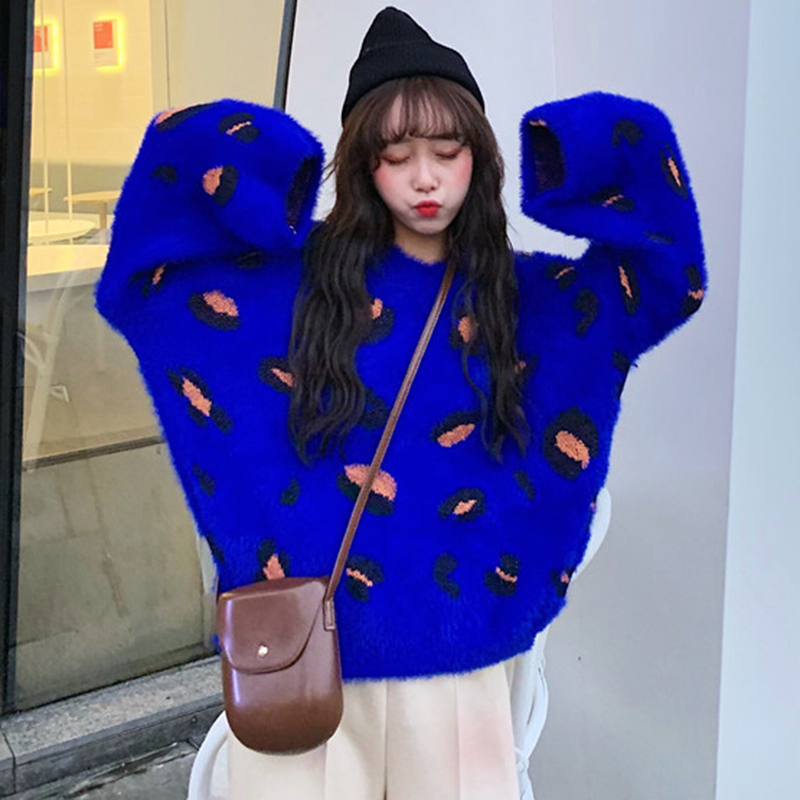 慵懶圓領毛衣女秋冬裝2018新款寬松豹紋針織外套學生休閑長袖上衣