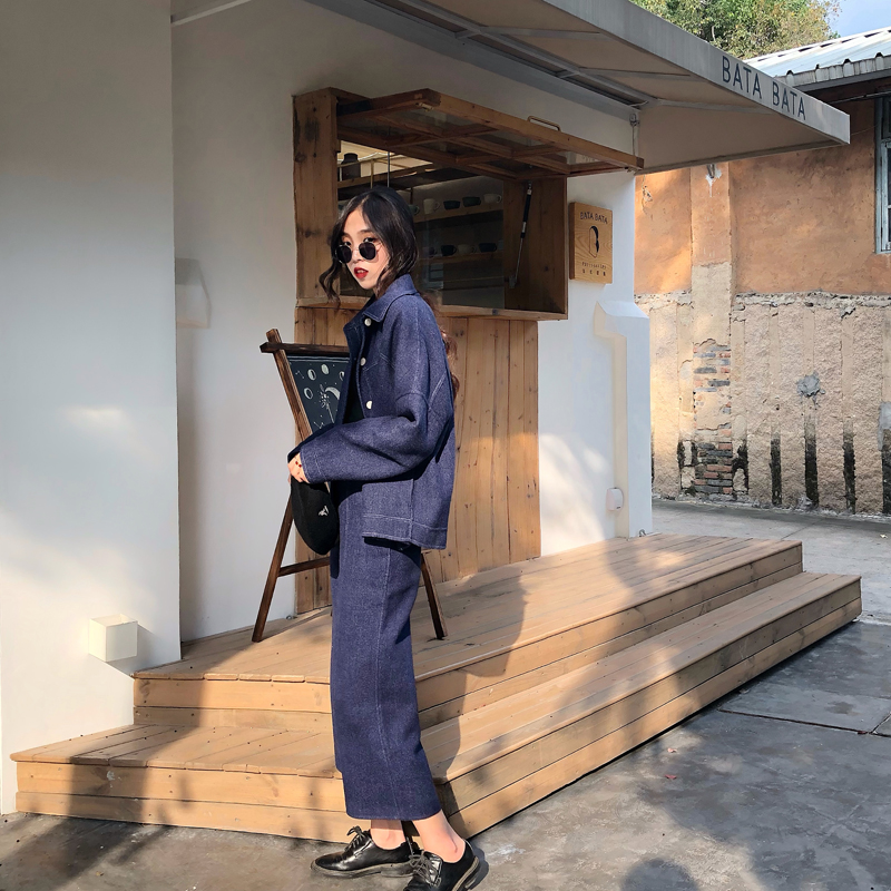 / 秋裝女2018新款時尚牛仔風羊毛雙面呢外套+短裙+闊腿褲三件套套裝