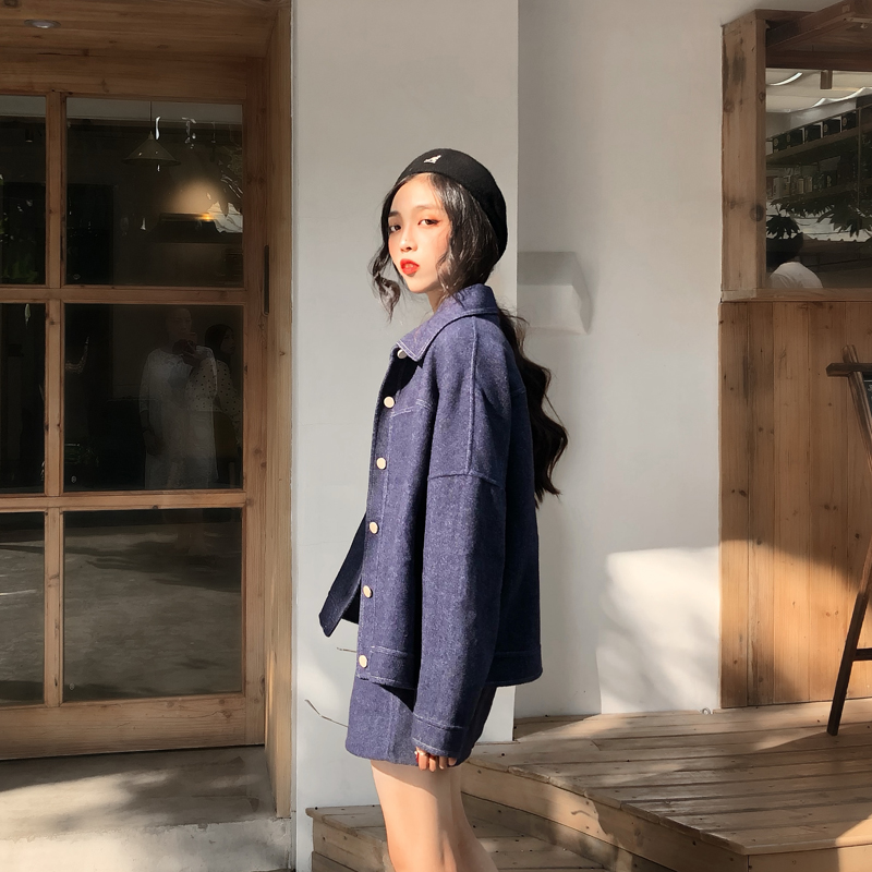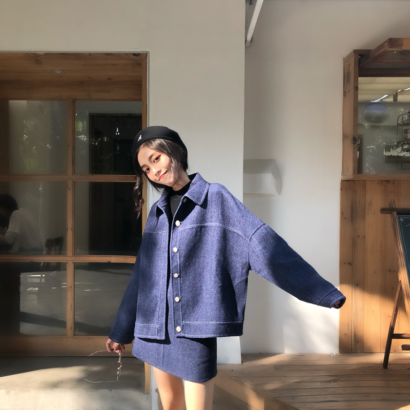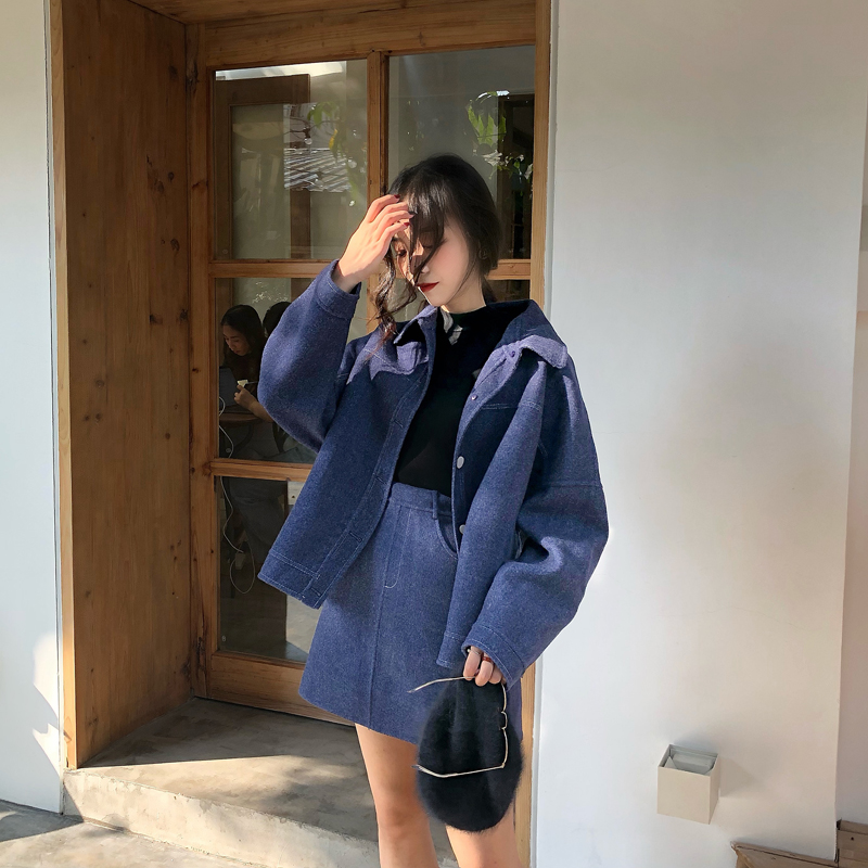 秋裝女2018新款時尚牛仔風羊毛雙面呢外套+短裙+闊腿褲三件套套裝