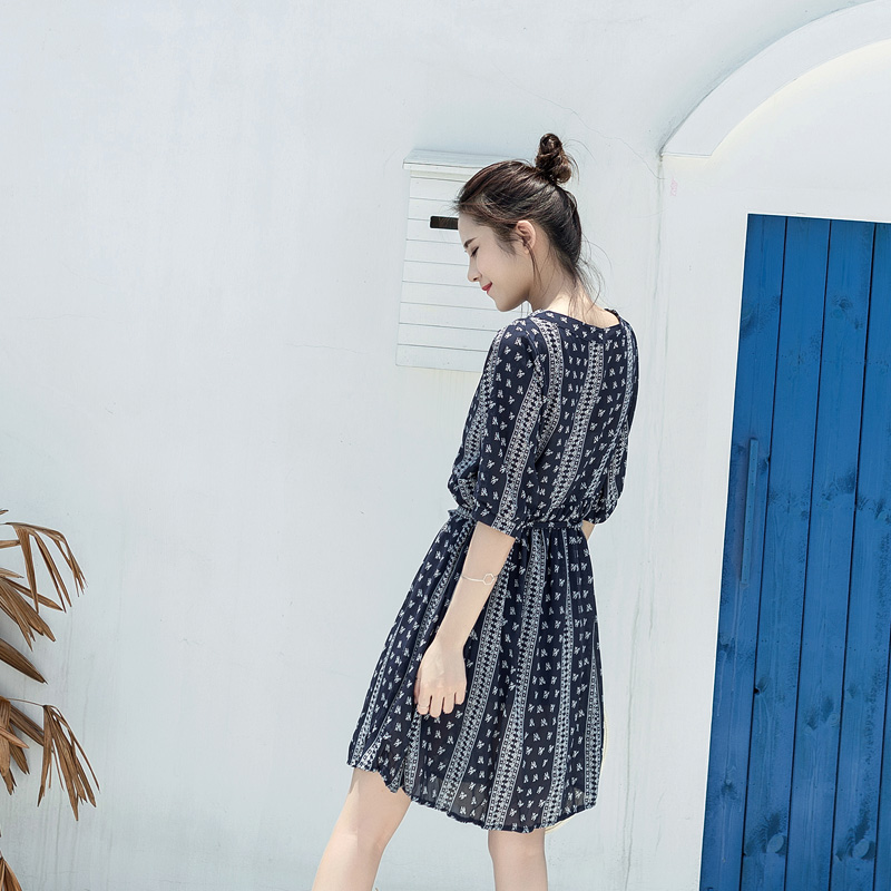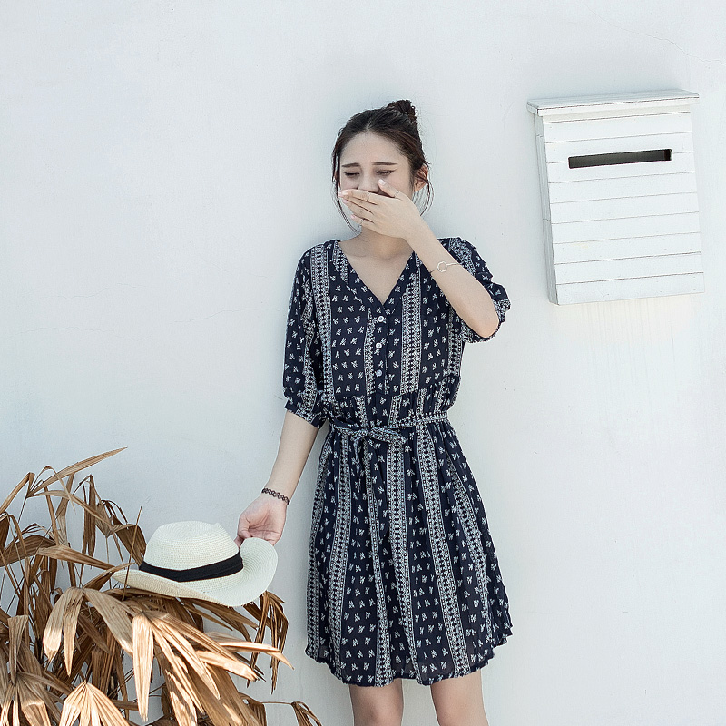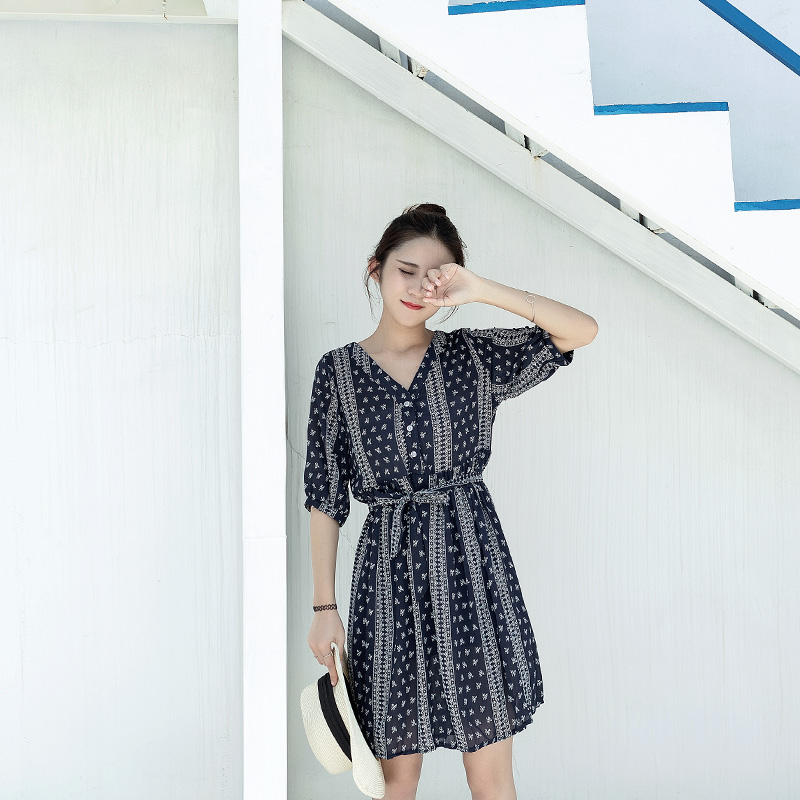 新款女裝夏裝韓版寬松連衣裙藍色印花復古短袖V領中長款裙子