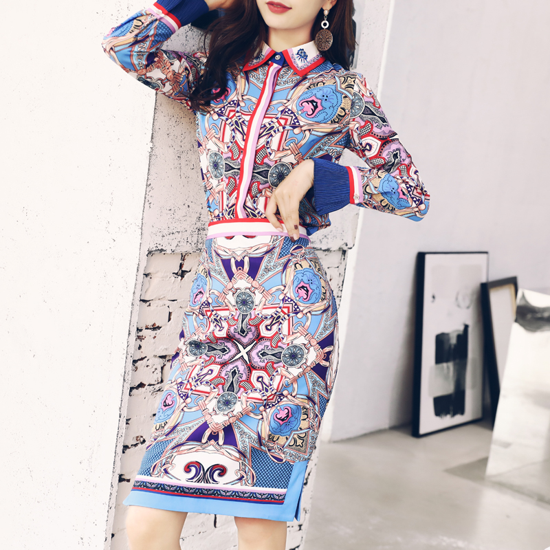 / 早秋裝2018新款時尚襯衫高腰印花半身裙兩件套港味成熟OL套裝女潮
