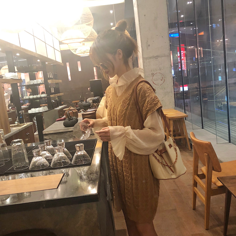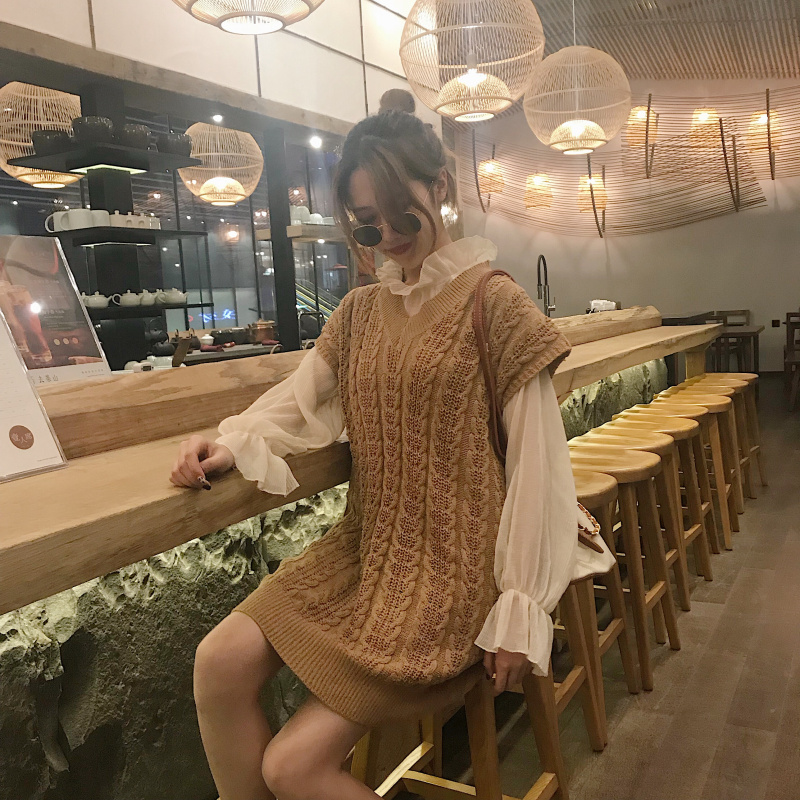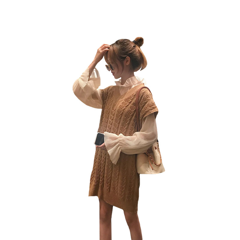 / 韓版時尚休閑套裝秋季中長款毛衣針織馬甲背心+雪紡襯衫兩件套女
