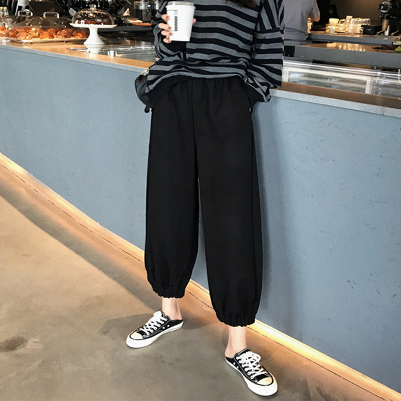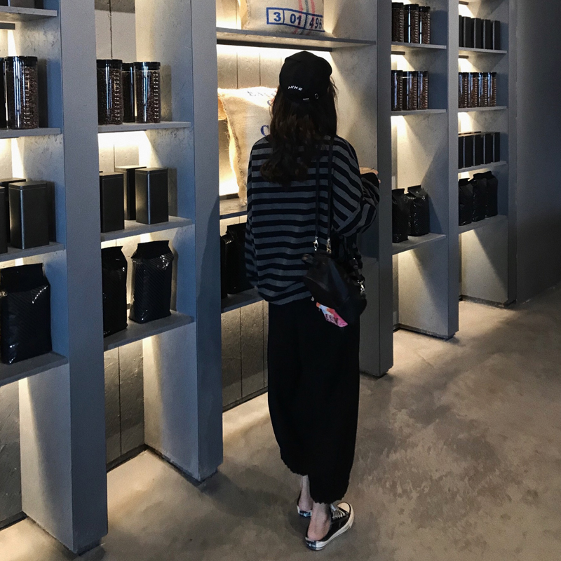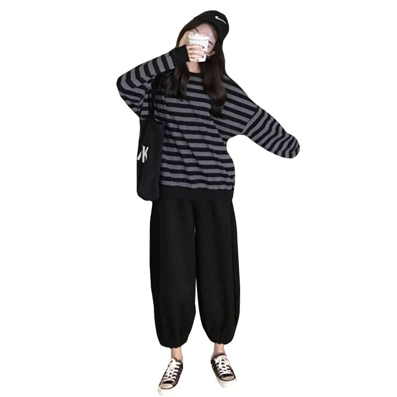 / 韓版時尚休閑套裝秋季女裝條紋衛衣外套+呢料闊腿褲燈籠褲兩件套