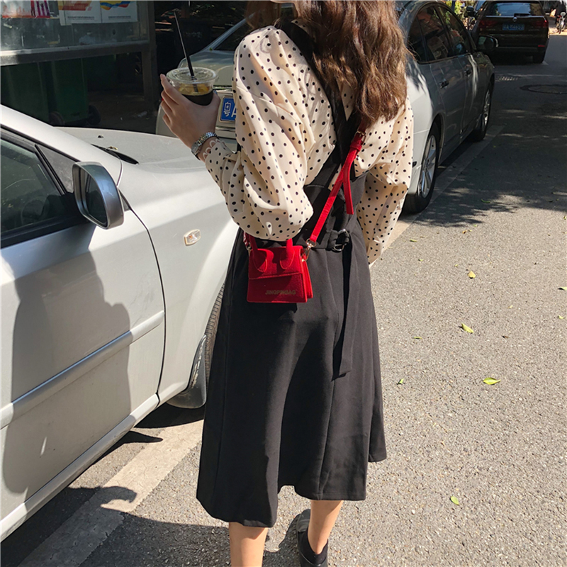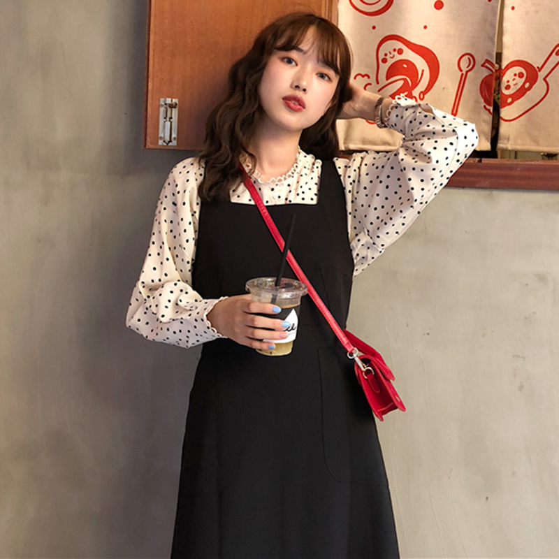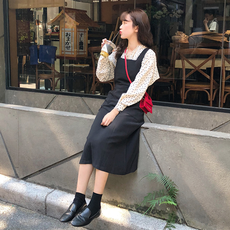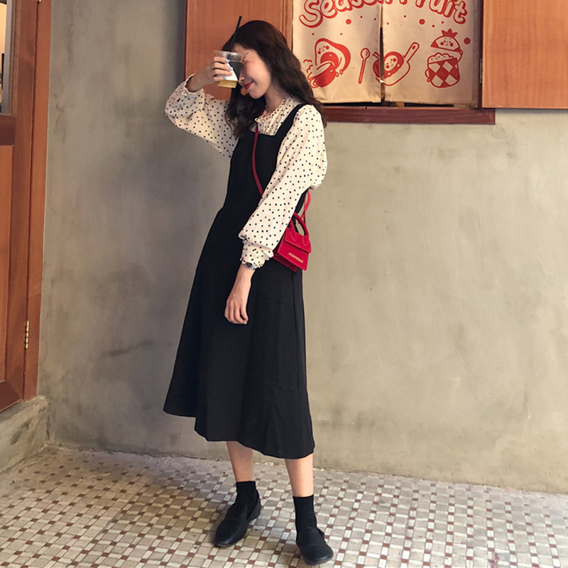 / 韓版時尚休閑套裝裙女秋裝新款百搭中長款背帶裙+長袖波點襯衫潮