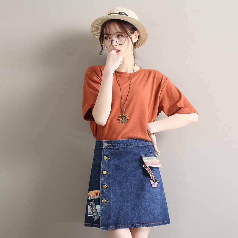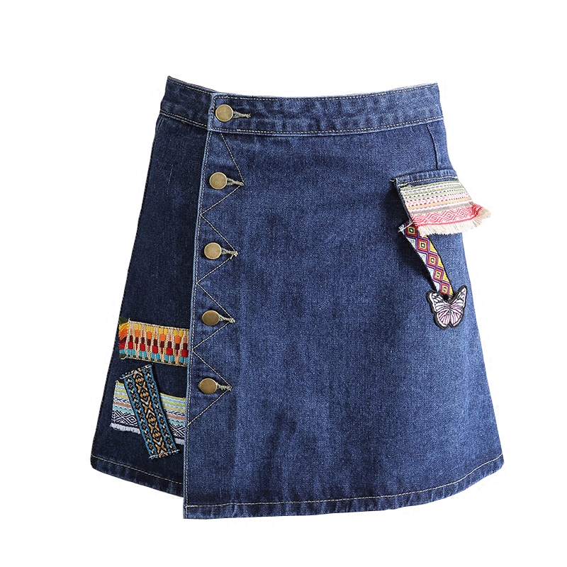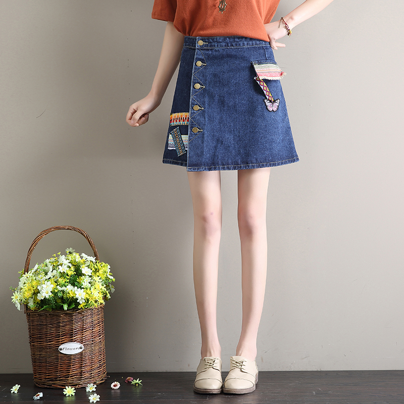 / 民族風牛仔裙半身裙女韓版高腰A字裙包臀短裙刺繡不規則半裙夏季