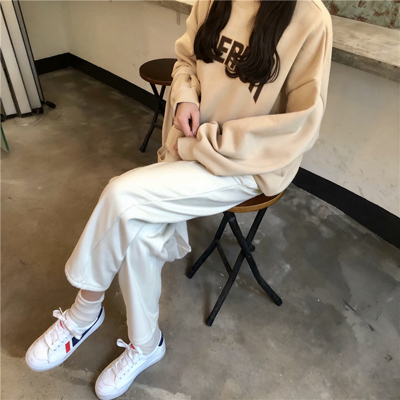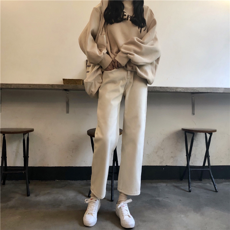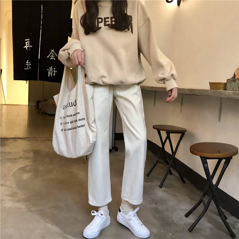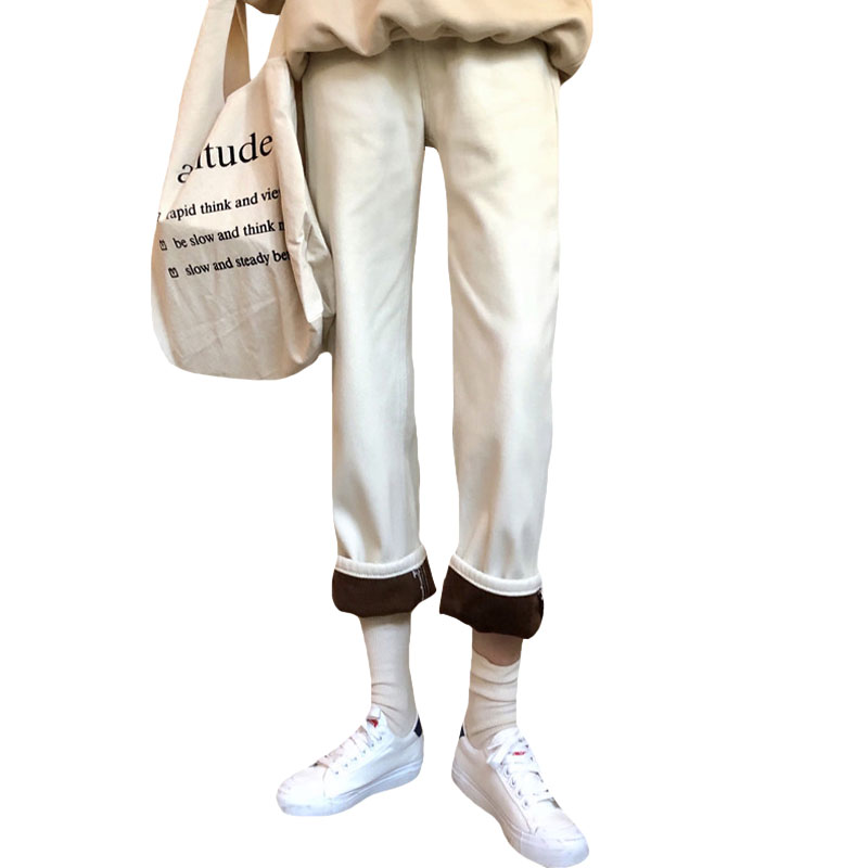 / 冬季女裝韓版寬松加絨加厚牛仔褲高腰直筒褲九分褲闊腿褲學生褲子