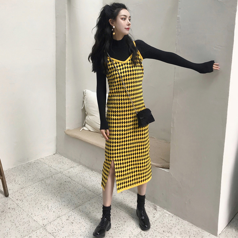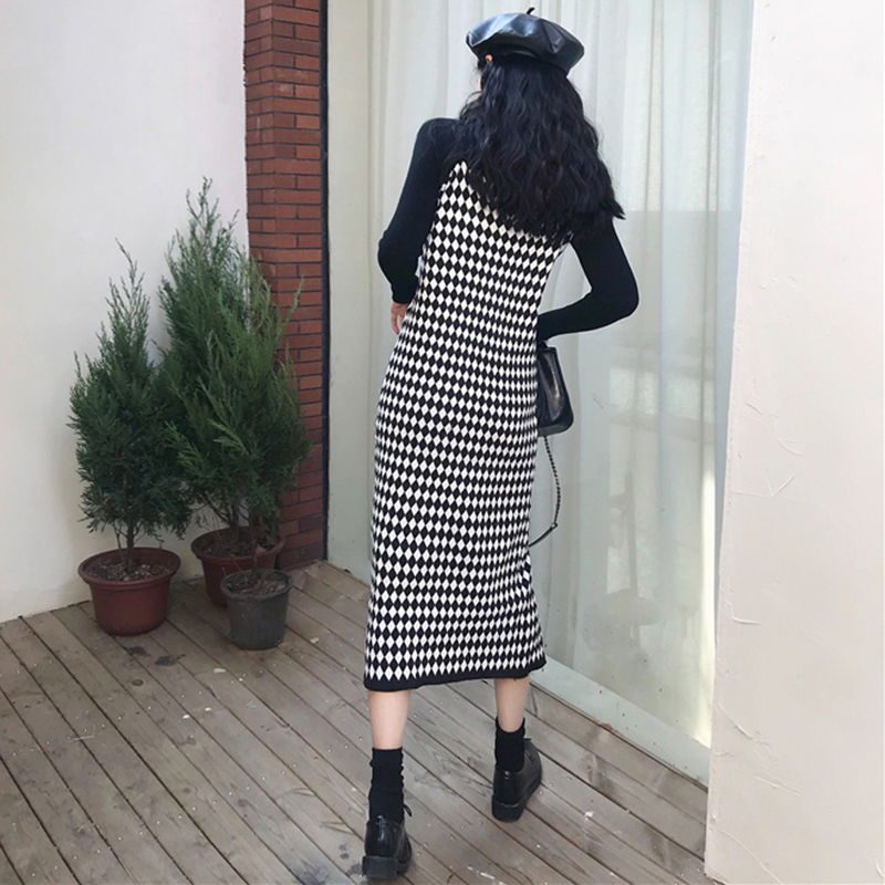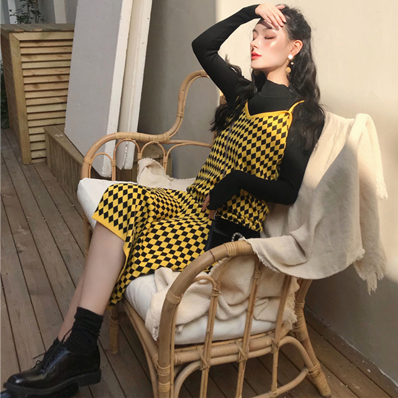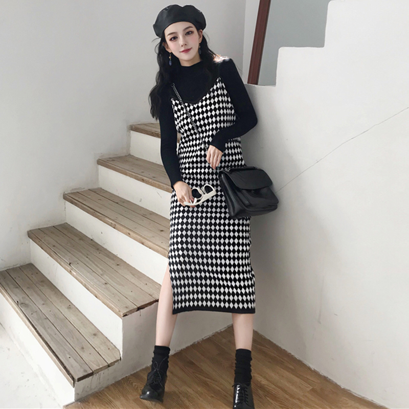 御姐針織套裝女秋冬新款修身長袖黑色打底T恤時尚格子吊帶連衣裙