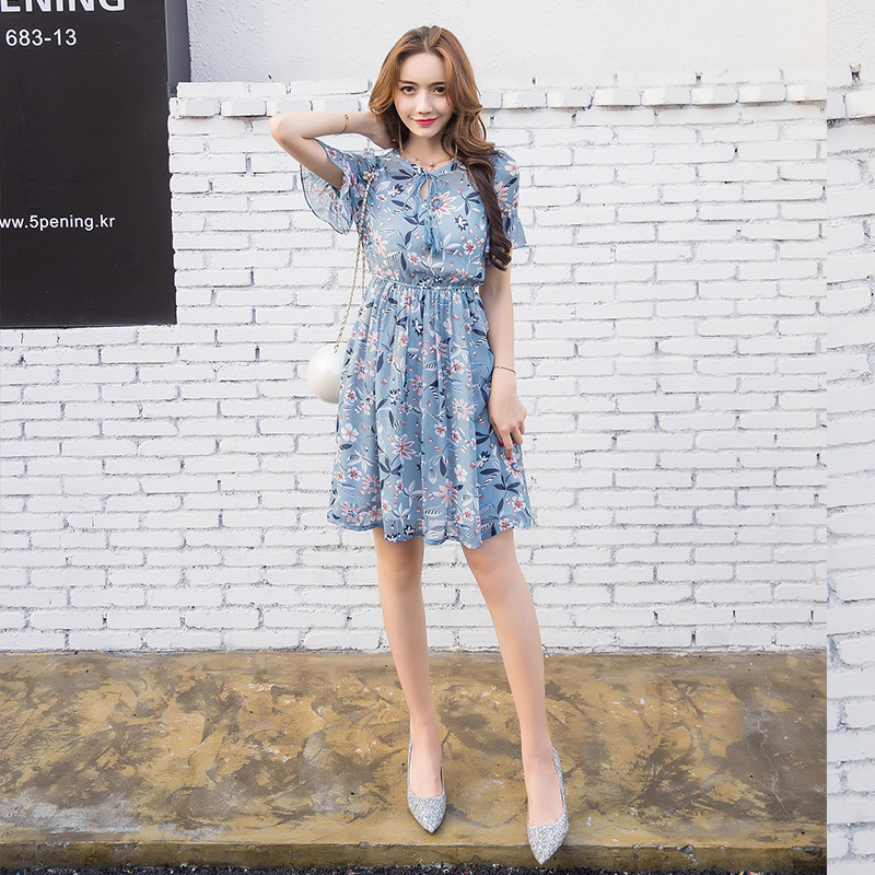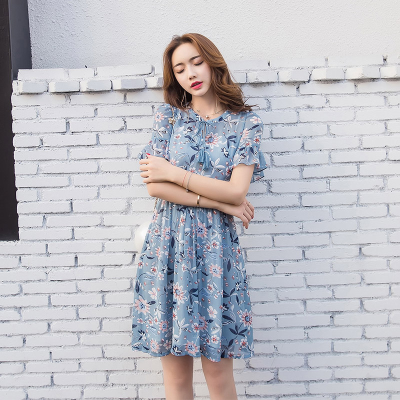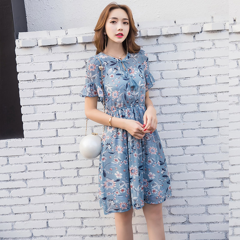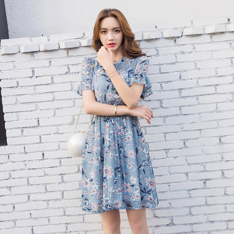 夏季新款碎花雪紡中長款連衣裙新款短袖印花荷葉袖修身a字裙