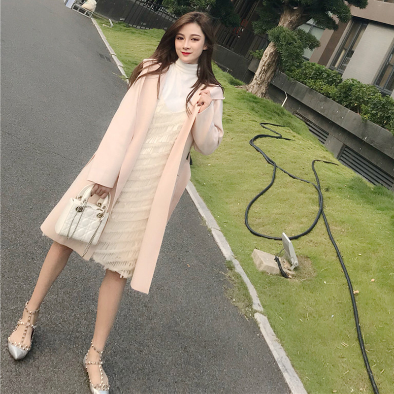 / 中長款2018流行呢子大衣女冬裝新款寬松長袖系帶收腰連帽毛呢外套