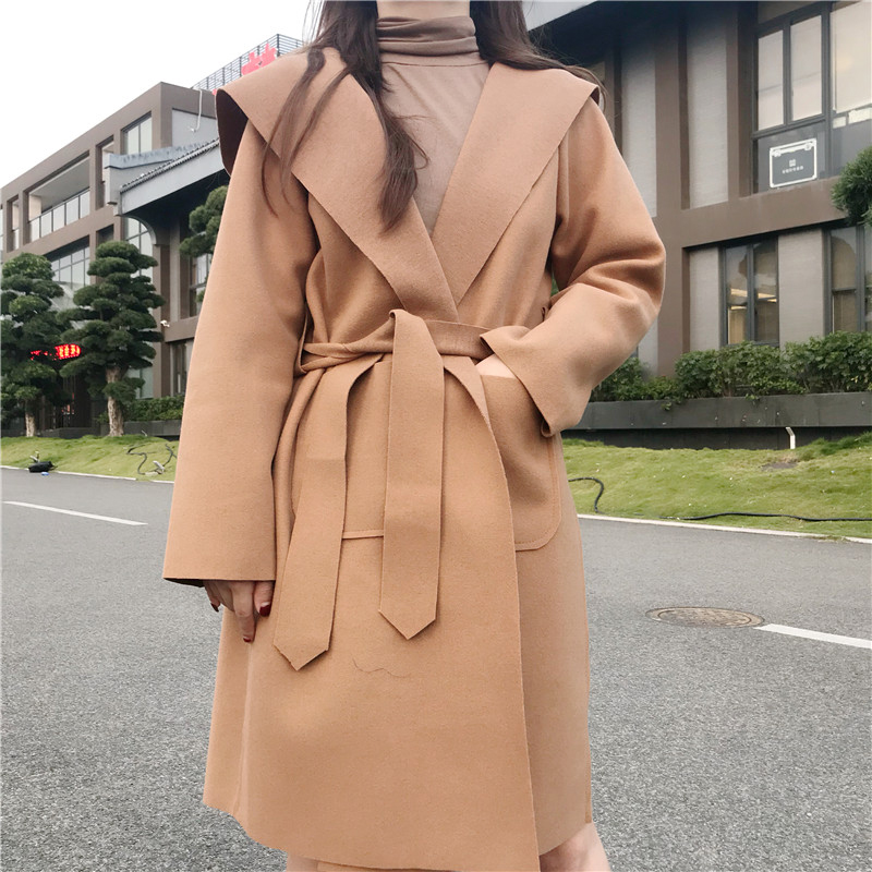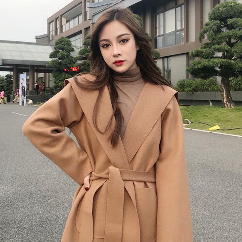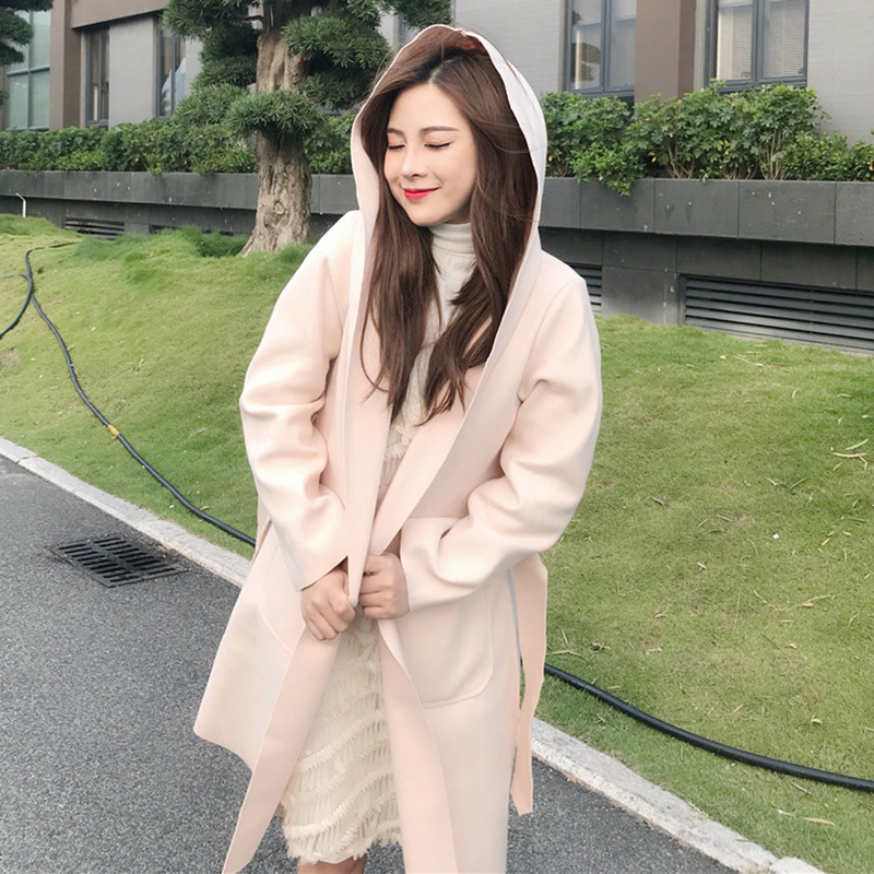 中長款2018流行呢子大衣女冬裝新款寬松長袖系帶收腰連帽毛呢外套