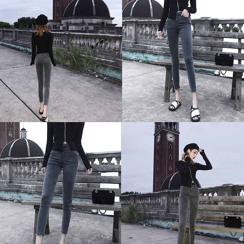 / 港味復古chic褲子煙灰色破洞高腰顯瘦毛邊牛仔九分小腳褲鉛筆褲潮