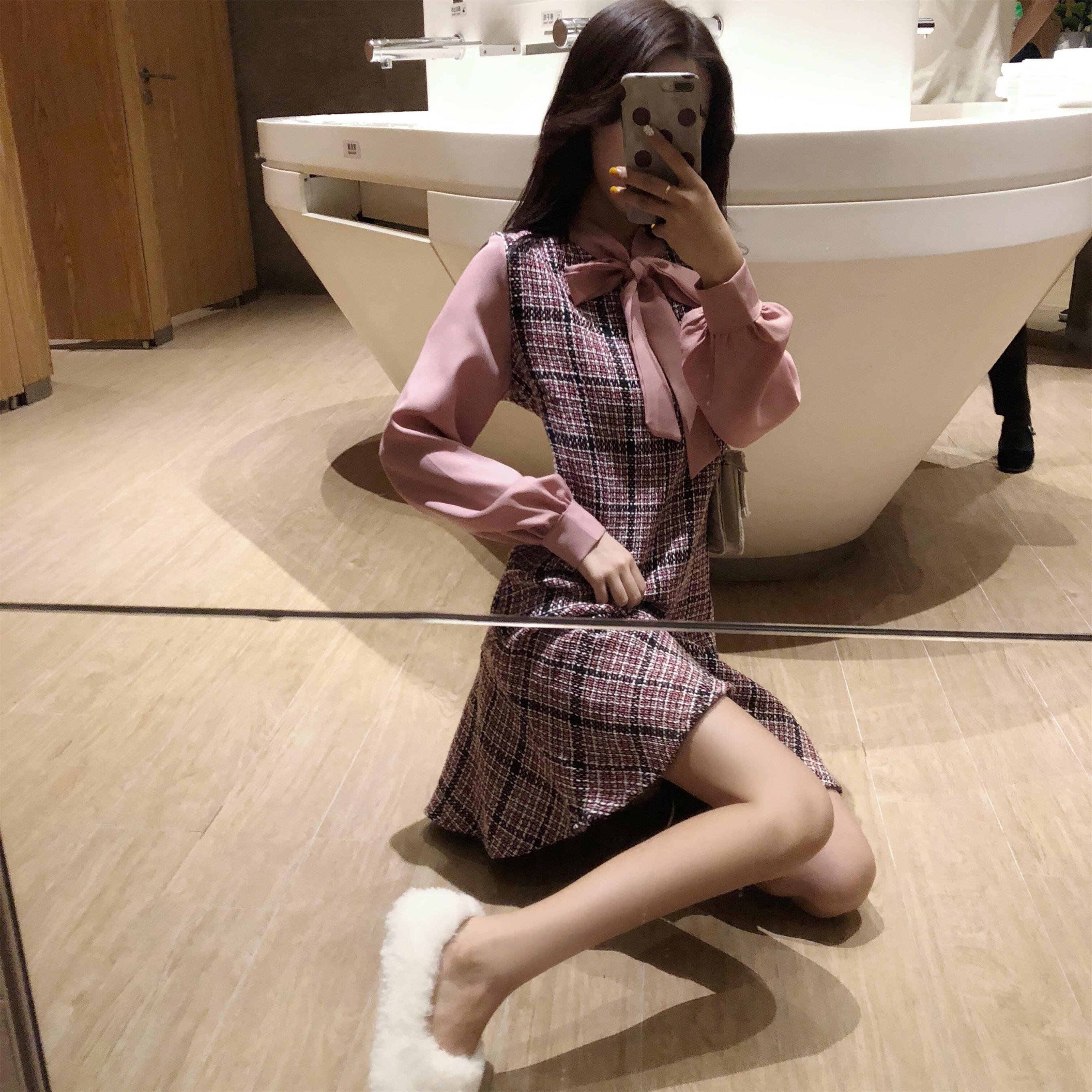 / 時尚氣質新款秋季chic韓版百搭長袖襯衫格子中裙淑女蝴蝶結連衣裙