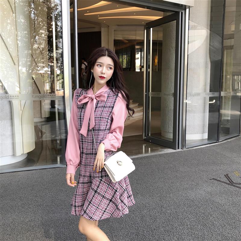 時尚氣質新款秋季chic韓版百搭長袖襯衫格子中裙淑女蝴蝶結連衣裙