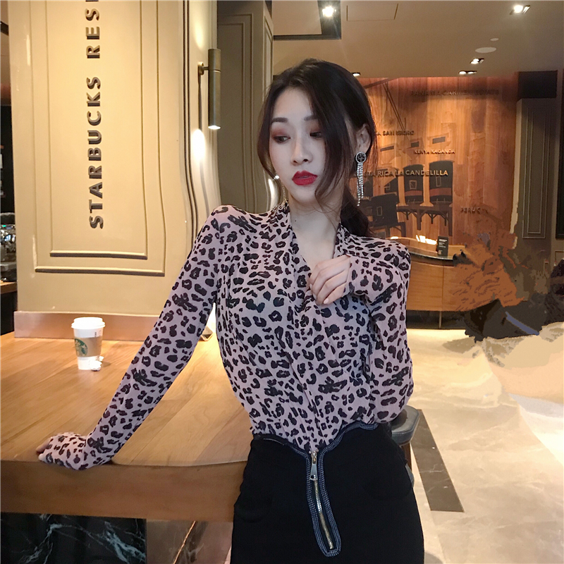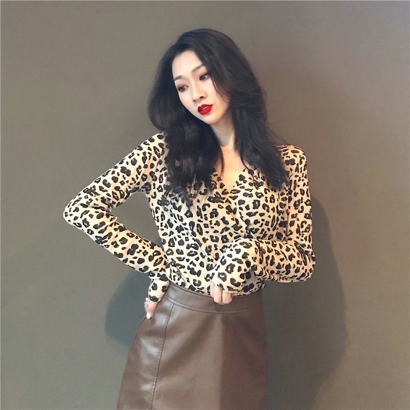 / 網紅打底衫新款韓版小心機俏皮豹紋網紗蕾絲顯瘦長袖交叉領T恤女