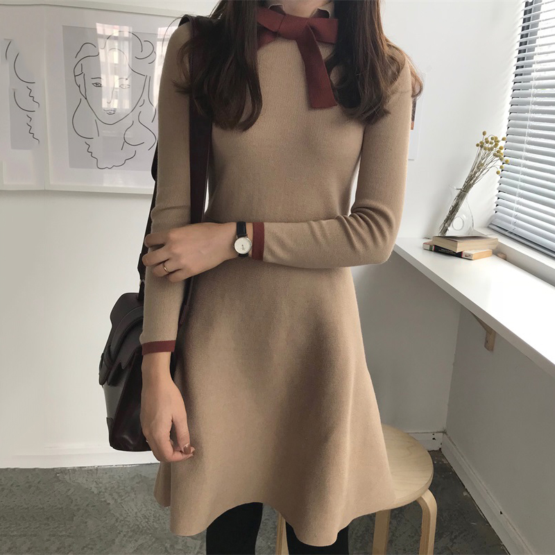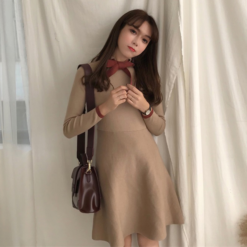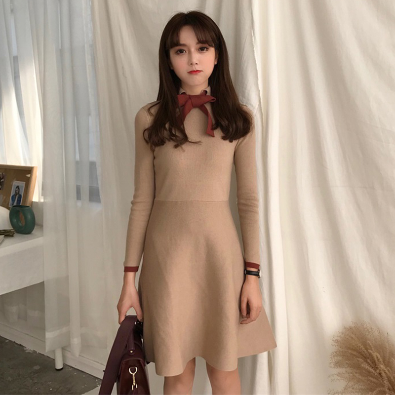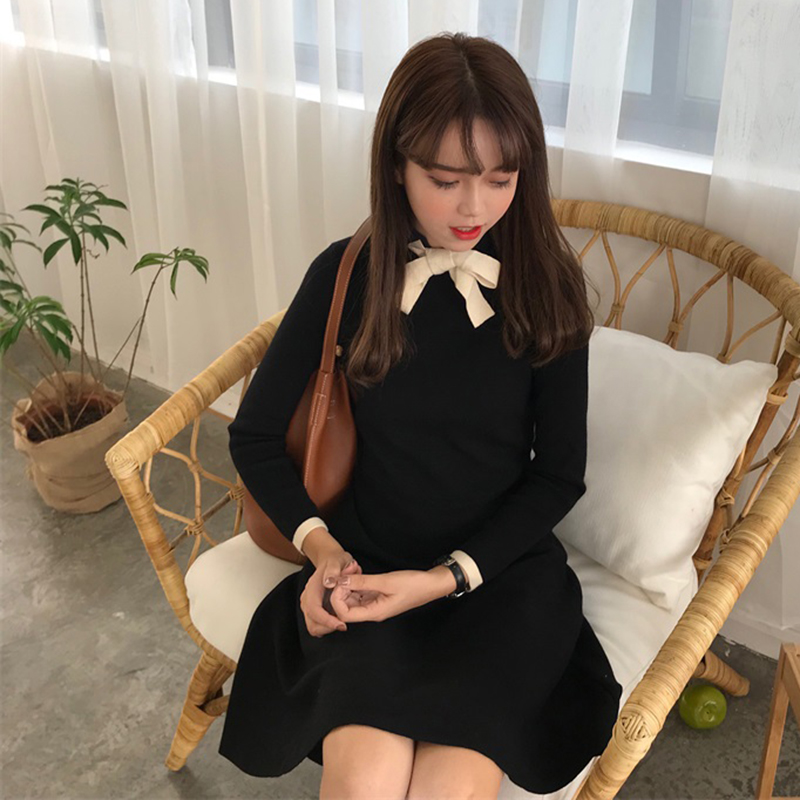 小黑裙秋裝女2018新款修身顯瘦a字短裙子蝴蝶結領針織打底連衣裙