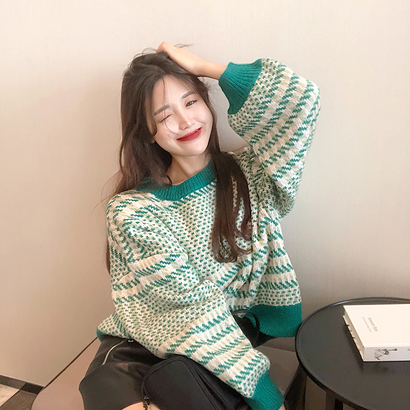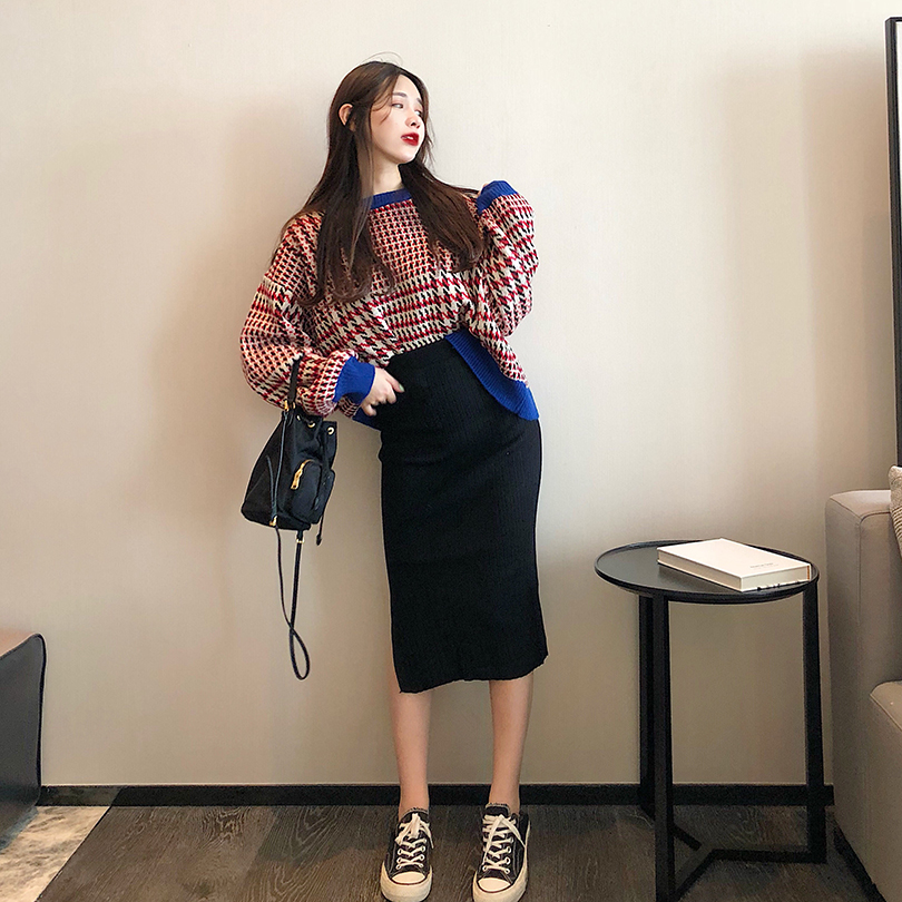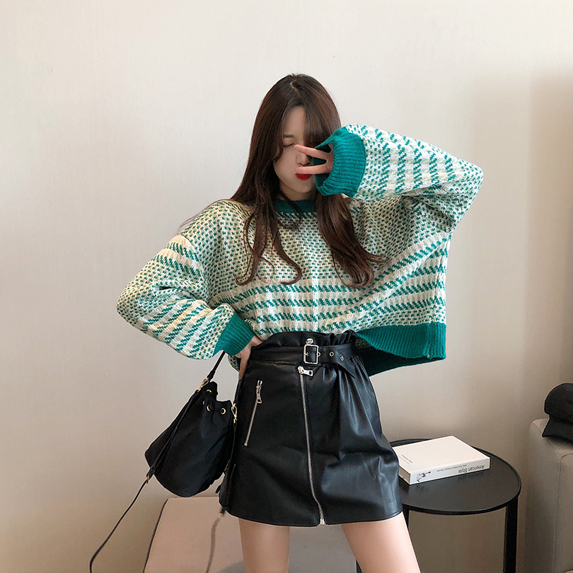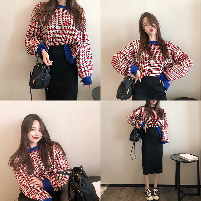 / 韓版網紅慵懶毛衣女套頭寬松chic時尚百搭格子針織衫短款長袖上衣