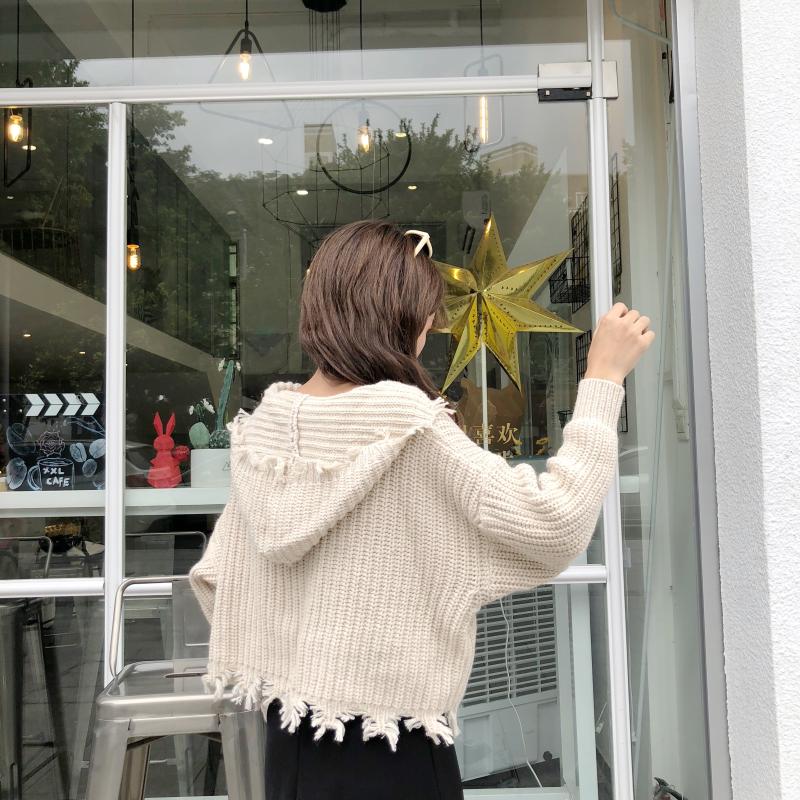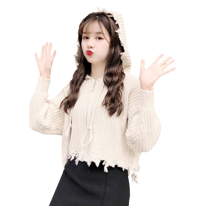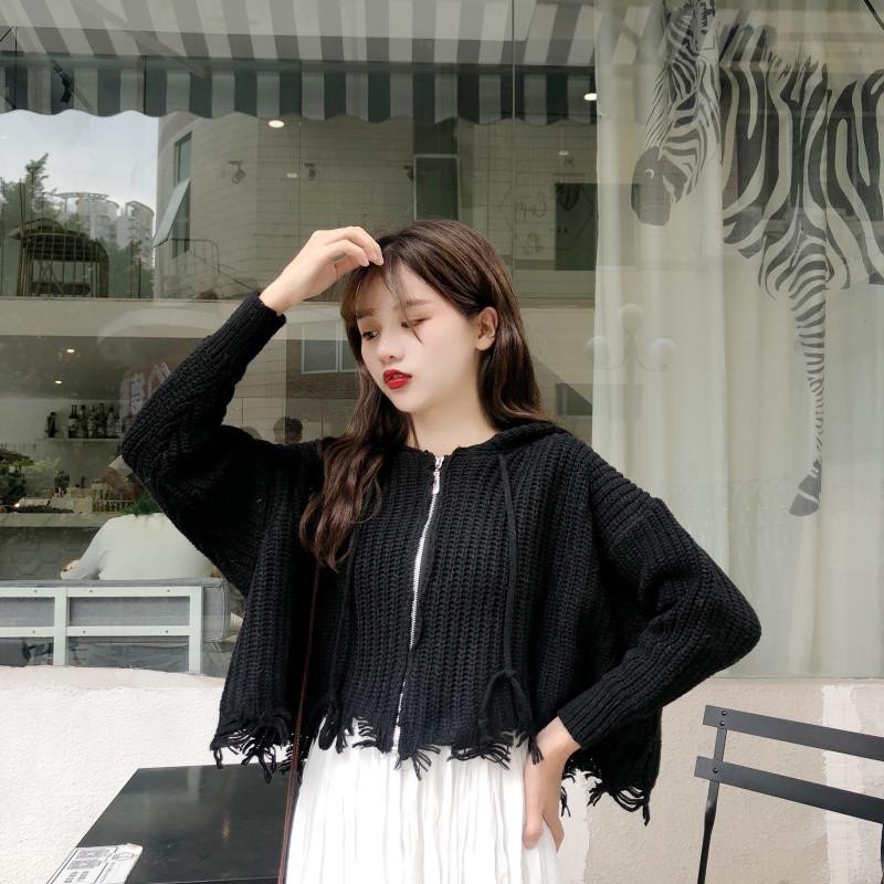 / 秋季女裝韓版連帽短款不規則粗線拉鏈毛衣外套寬松長袖針織衫上衣