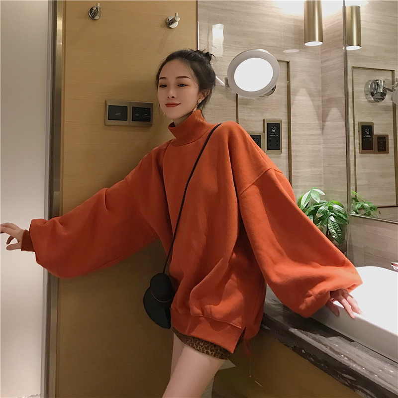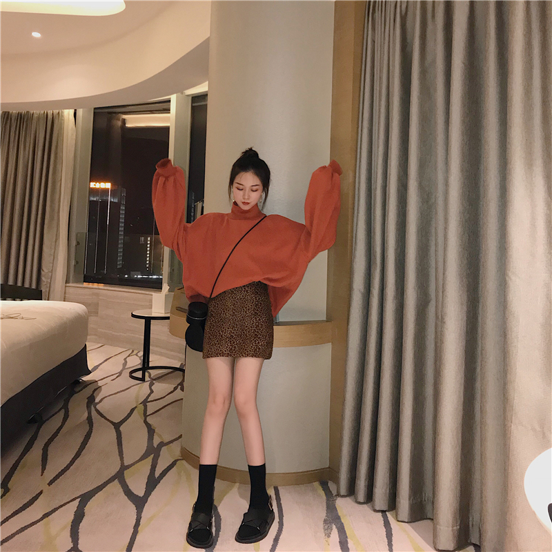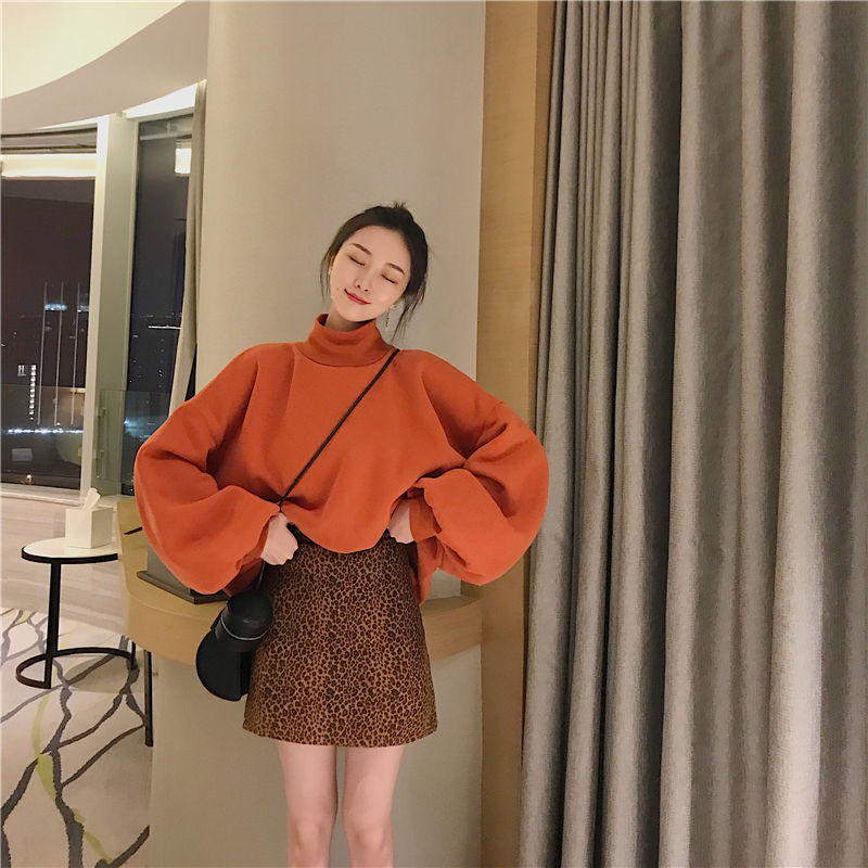 港味chic豹紋高腰顯瘦a字裙+寬松高領燈籠袖加絨衛衣套裝兩件套