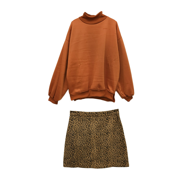 / 港味chic豹紋高腰顯瘦a字裙+寬松高領燈籠袖加絨衛衣套裝兩件套