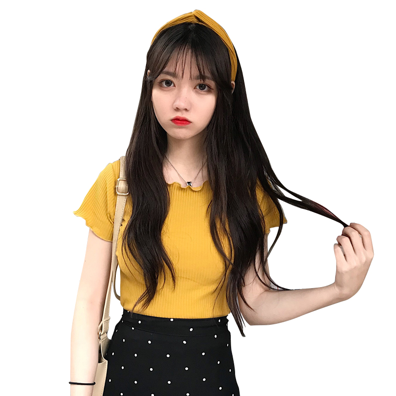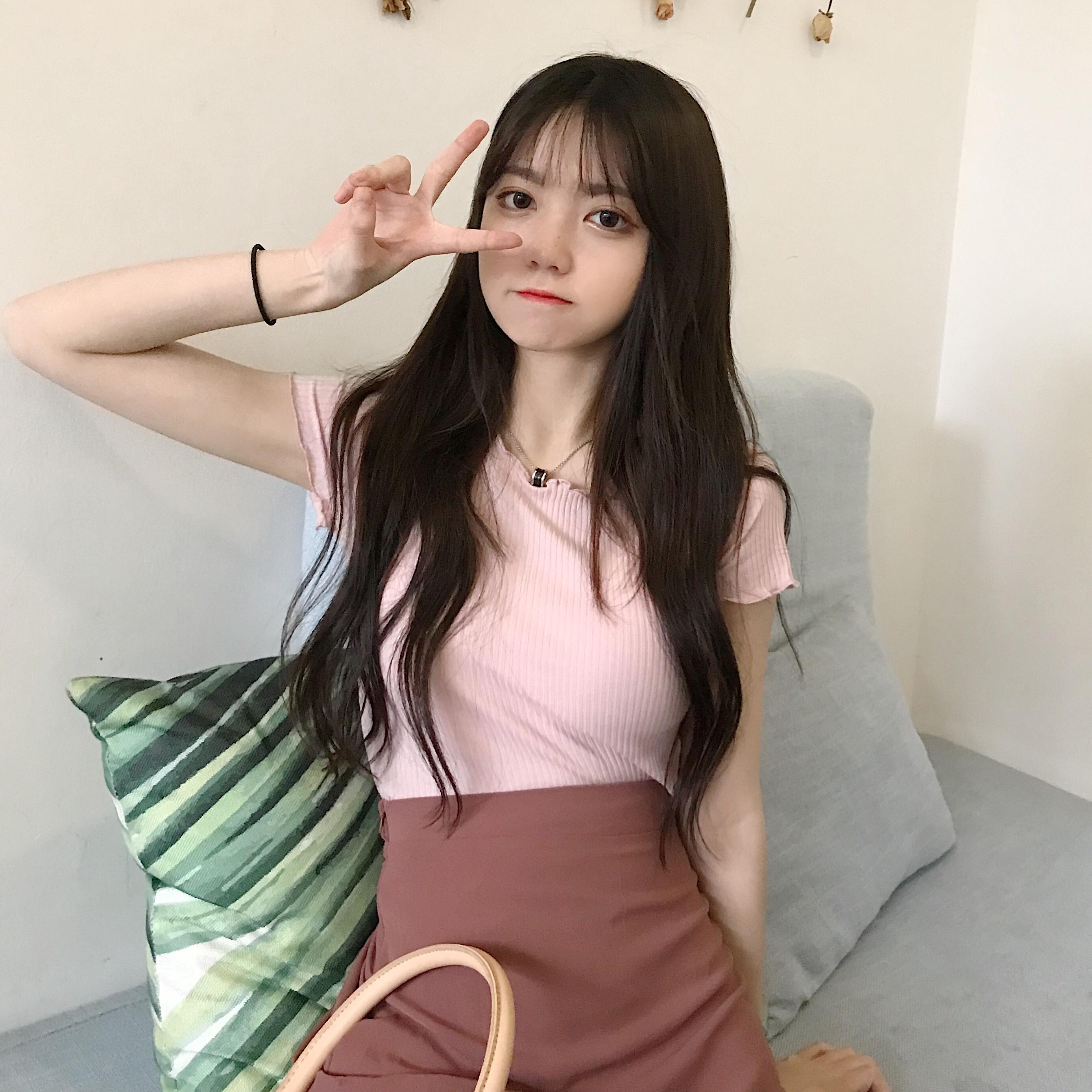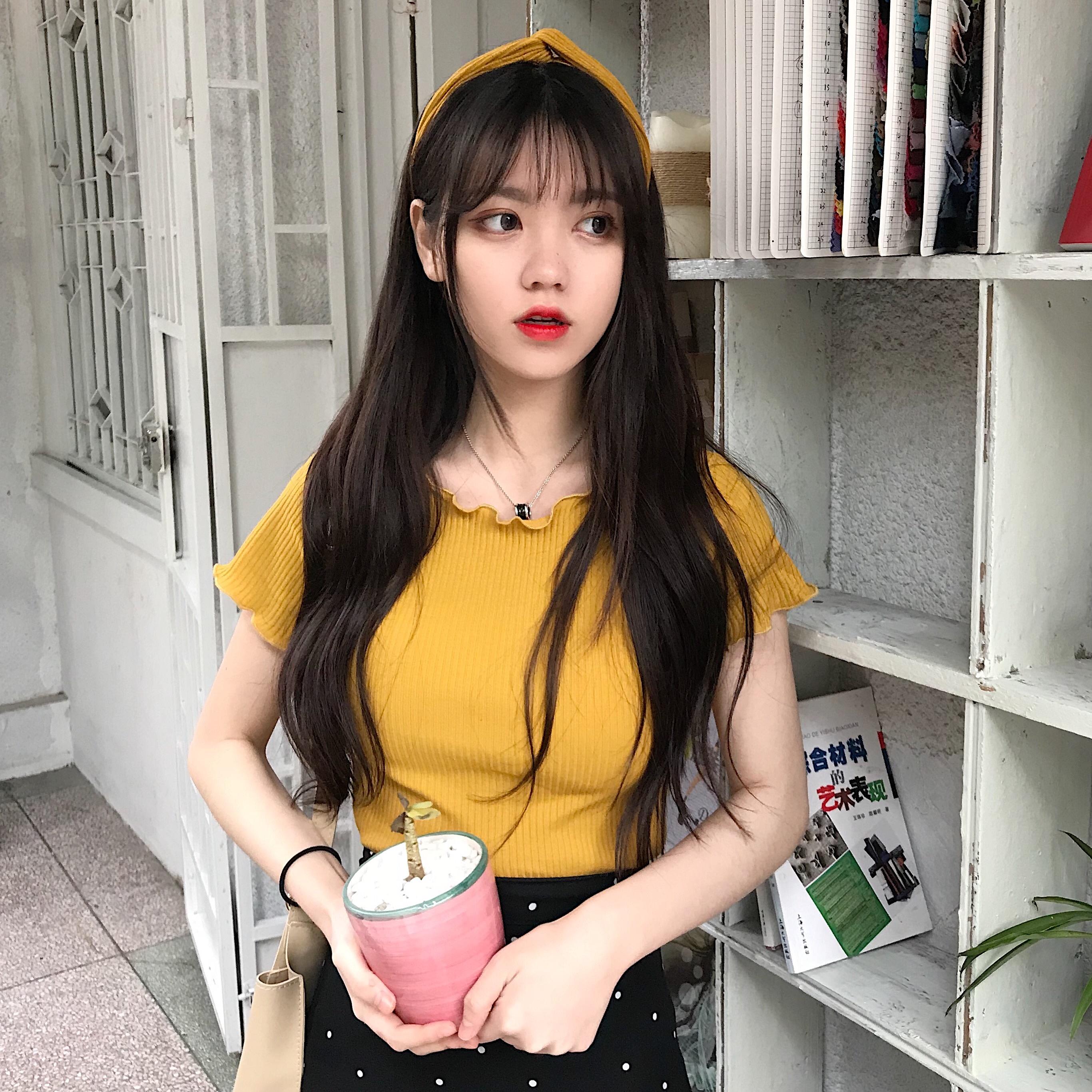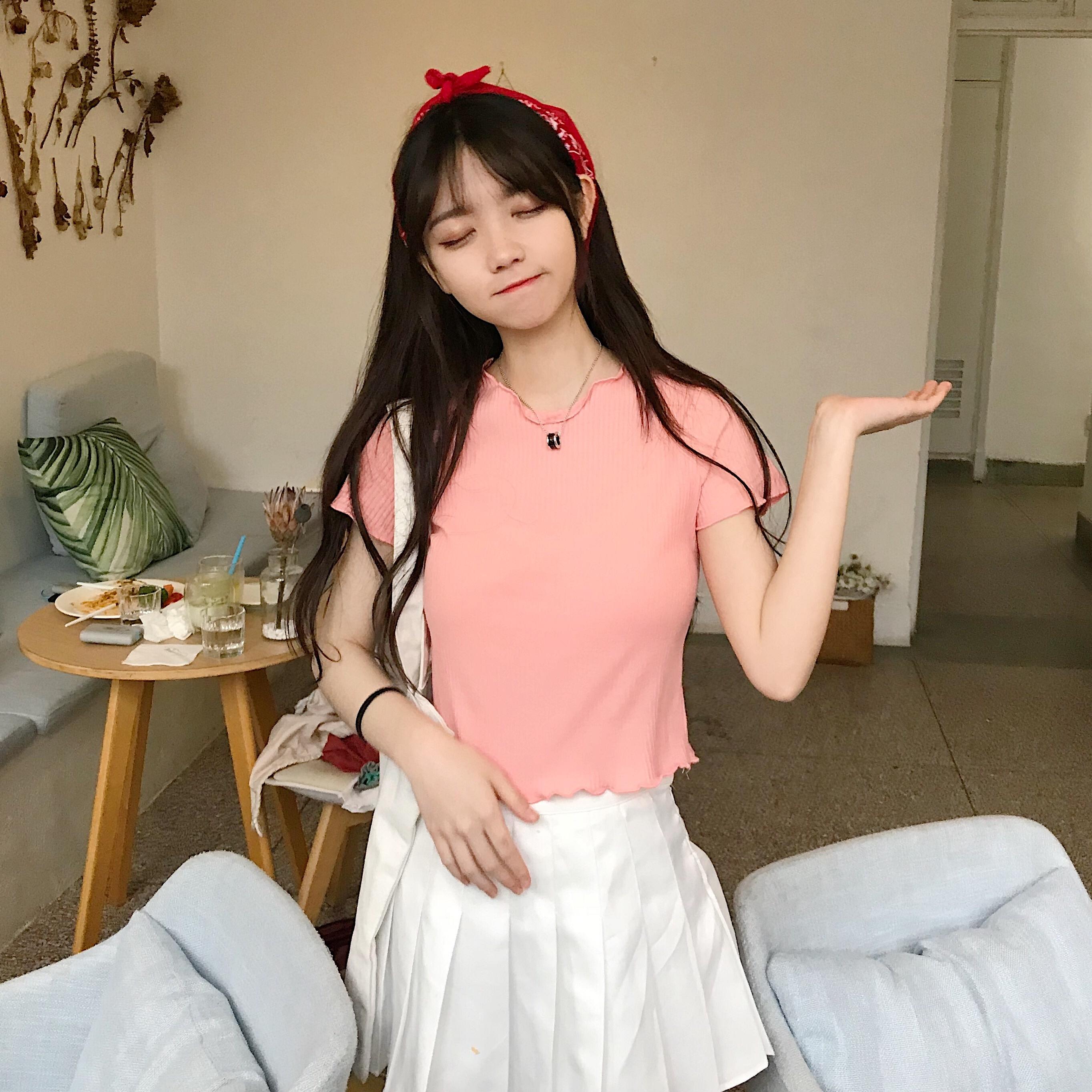 / 春夏女裝韓版修身顯瘦百搭坑條短款卷邊領T恤打底衫短袖上衣體恤