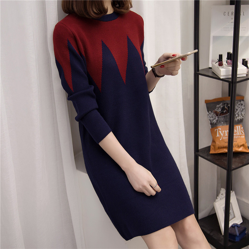 拼色長款針織衫套頭打底長袖韓版寬松毛衣女秋冬季女裝新款潮