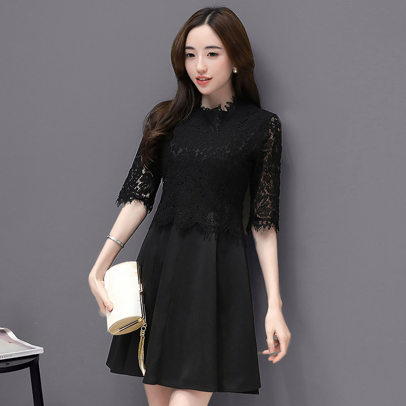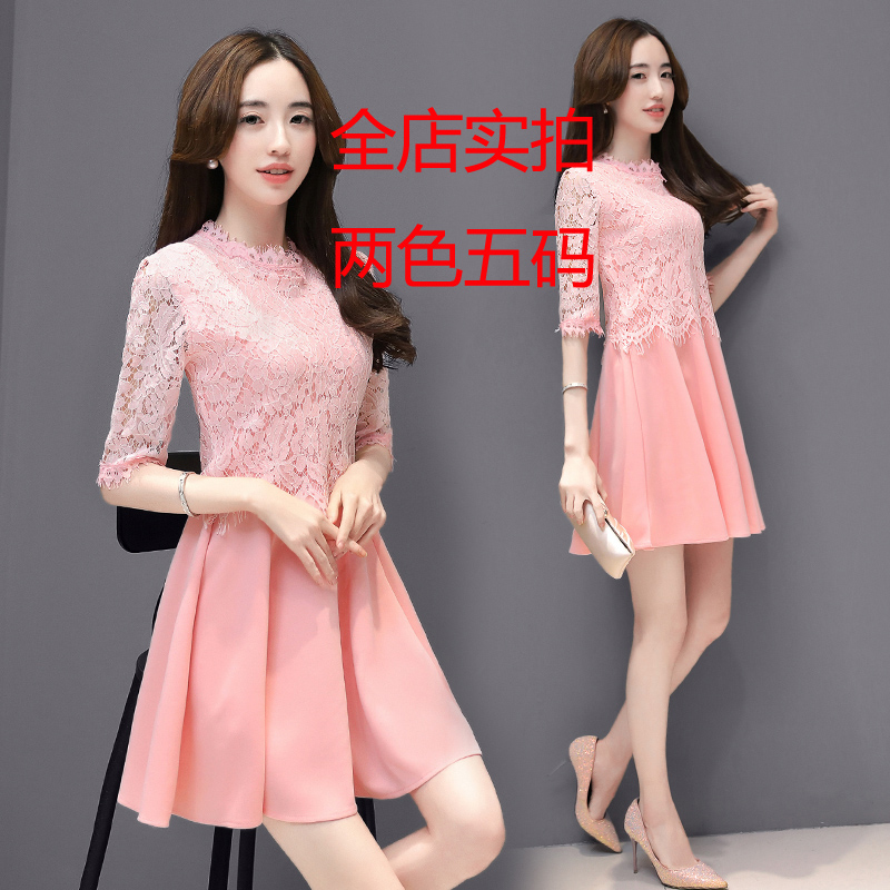 春季新款中裙五分袖蕾絲薄款時尚修身顯瘦假兩件打底連衣裙女