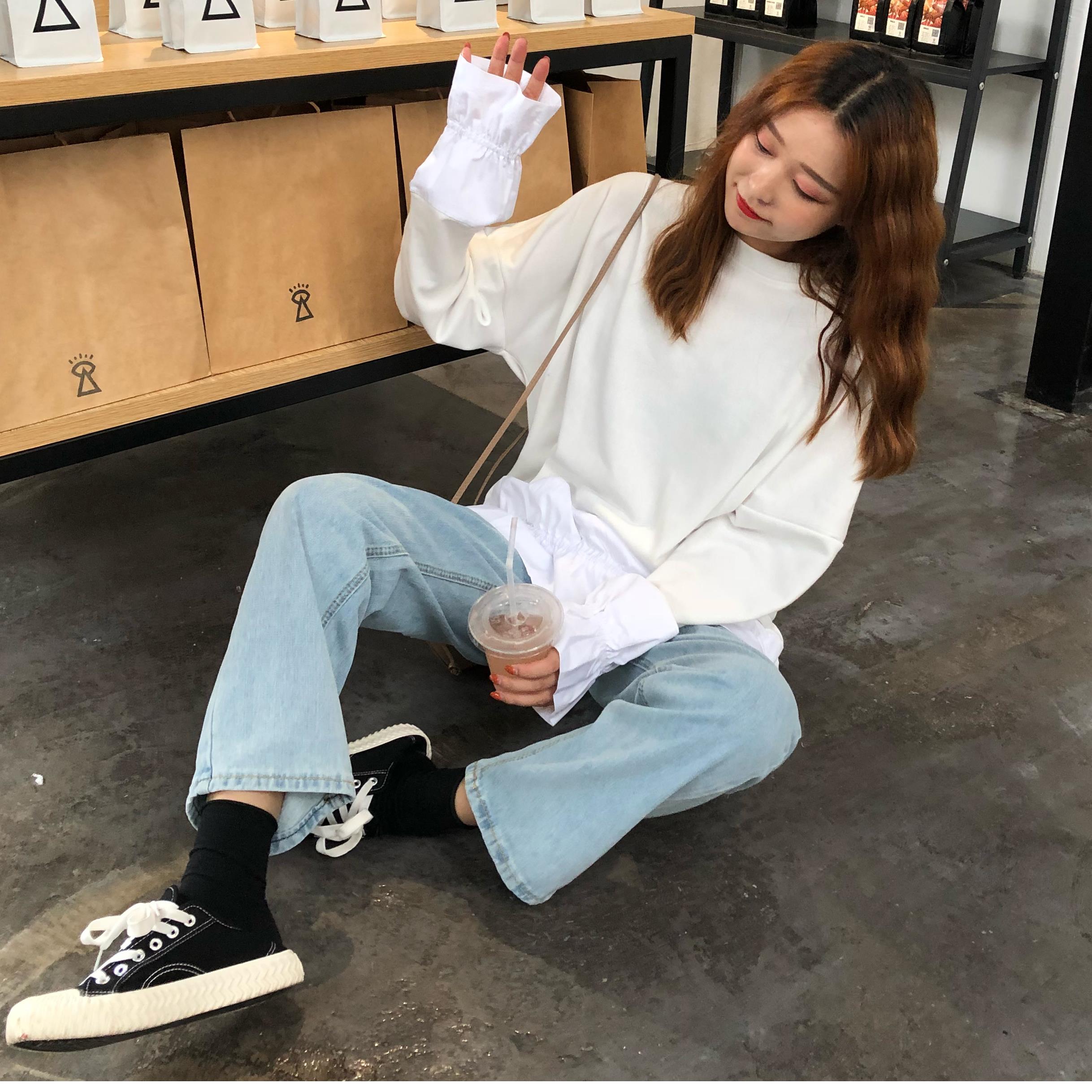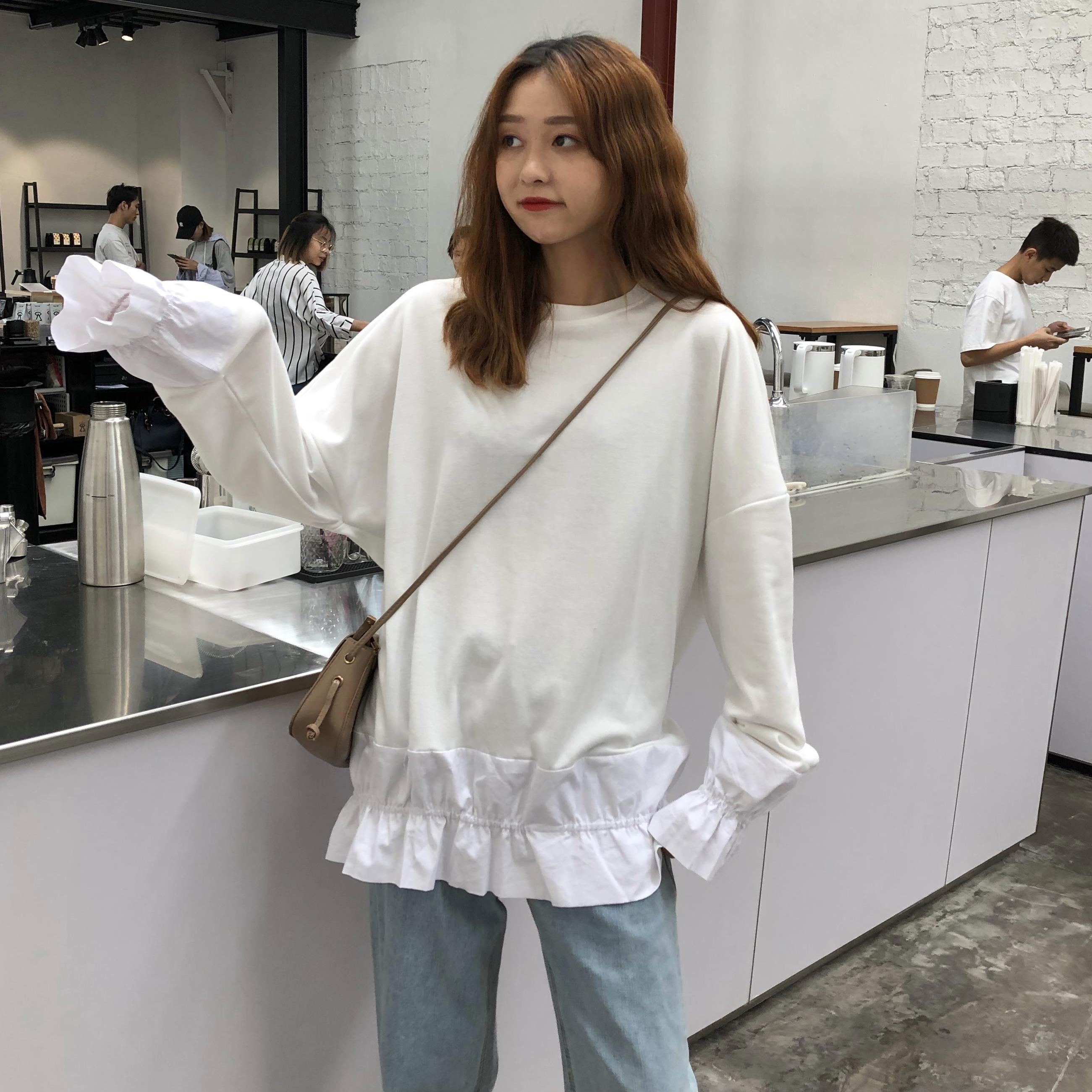 秋季女裝韓版寬松花苞邊拼接假兩件中長款套頭長袖衛衣裙上衣外套