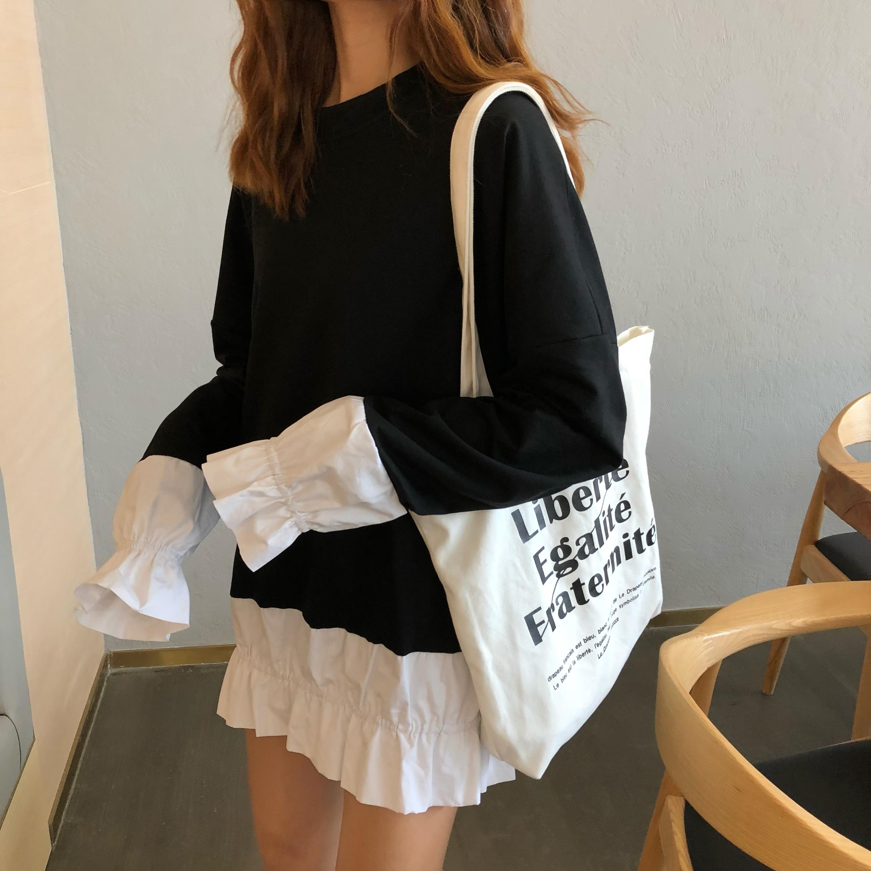 / 秋季女裝韓版寬松花苞邊拼接假兩件中長款套頭長袖衛衣裙上衣外套