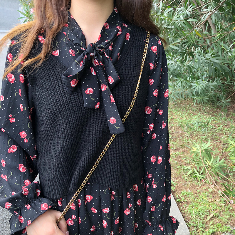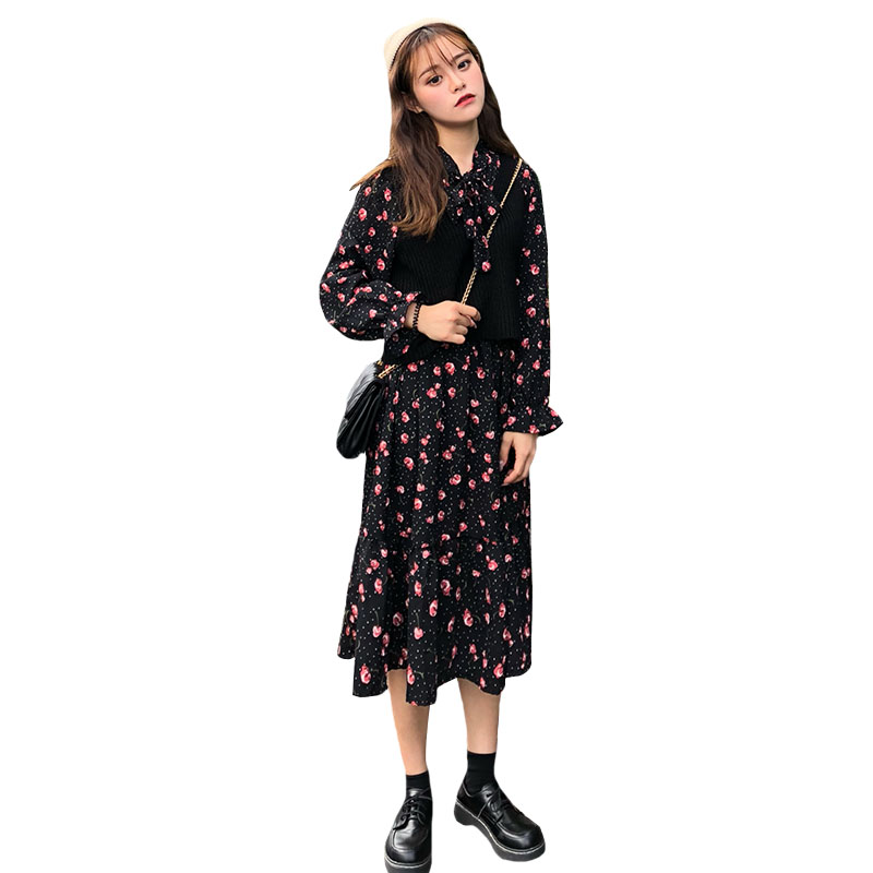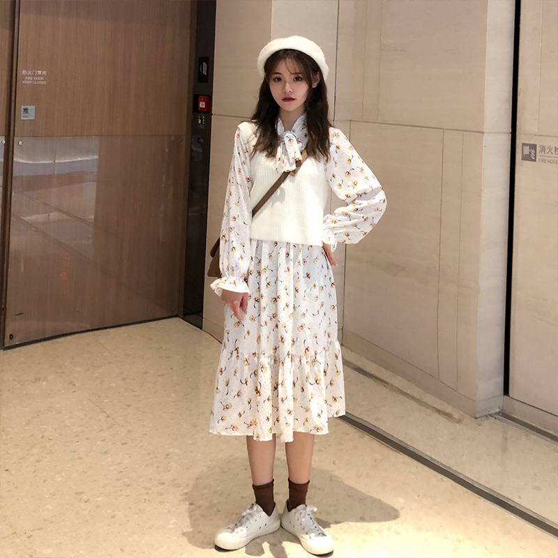 / 韓版時尚休閑套裝秋季女裝中長款碎花連衣裙+針織馬甲背心兩件套