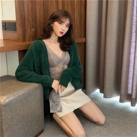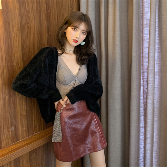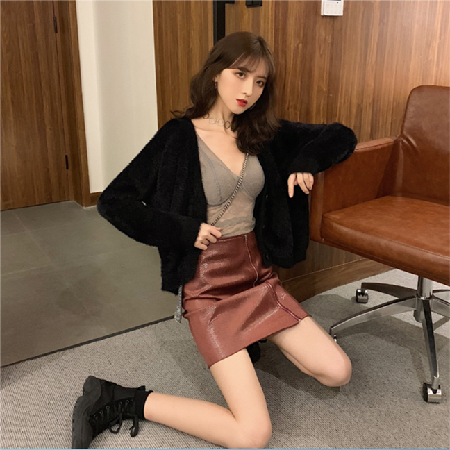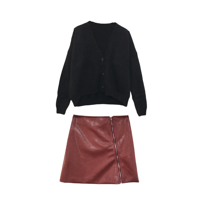 黑色開衫|綠色開衫|紅色皮裙|米白皮裙