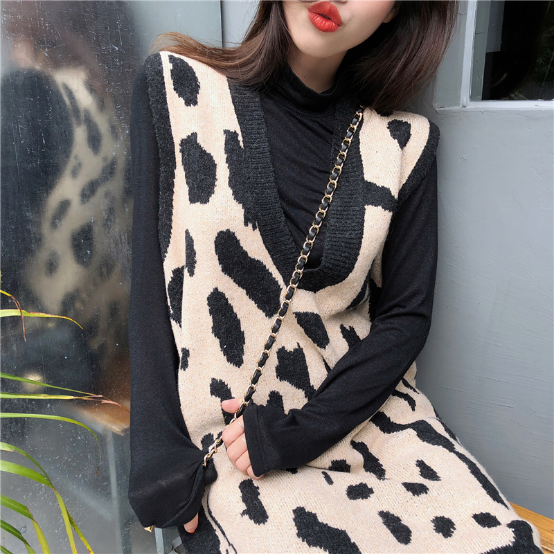 時尚撞色V領無袖豹紋針織背心馬甲+高領打底衫+針織包臀裙三件套