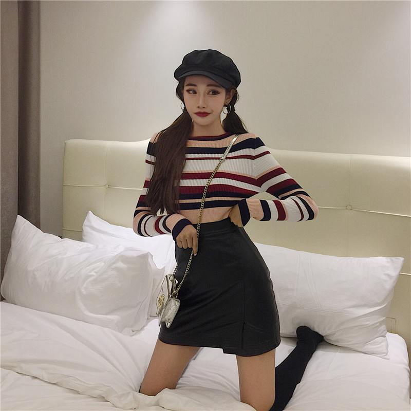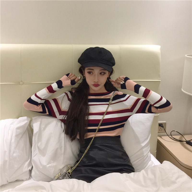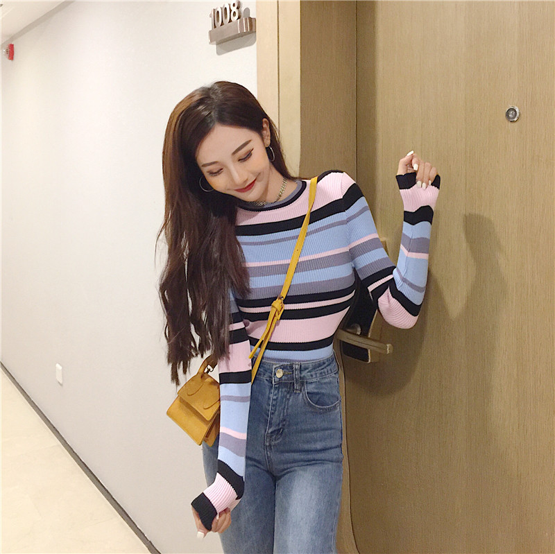 / 時尚秋裝女2018新款氣質百搭韓版拼色彩條圓領顯瘦針織衫打底衫潮