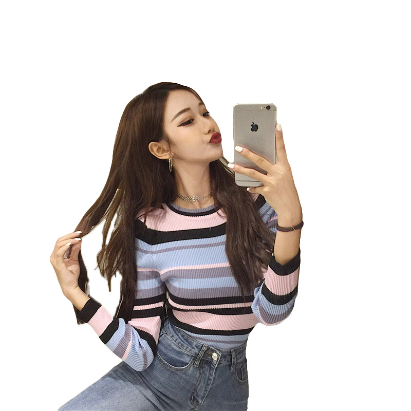 韓版時尚長袖針織衫秋裝女2018新款百搭修身顯瘦圓領條紋上衣學生