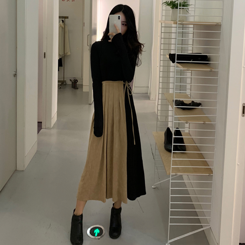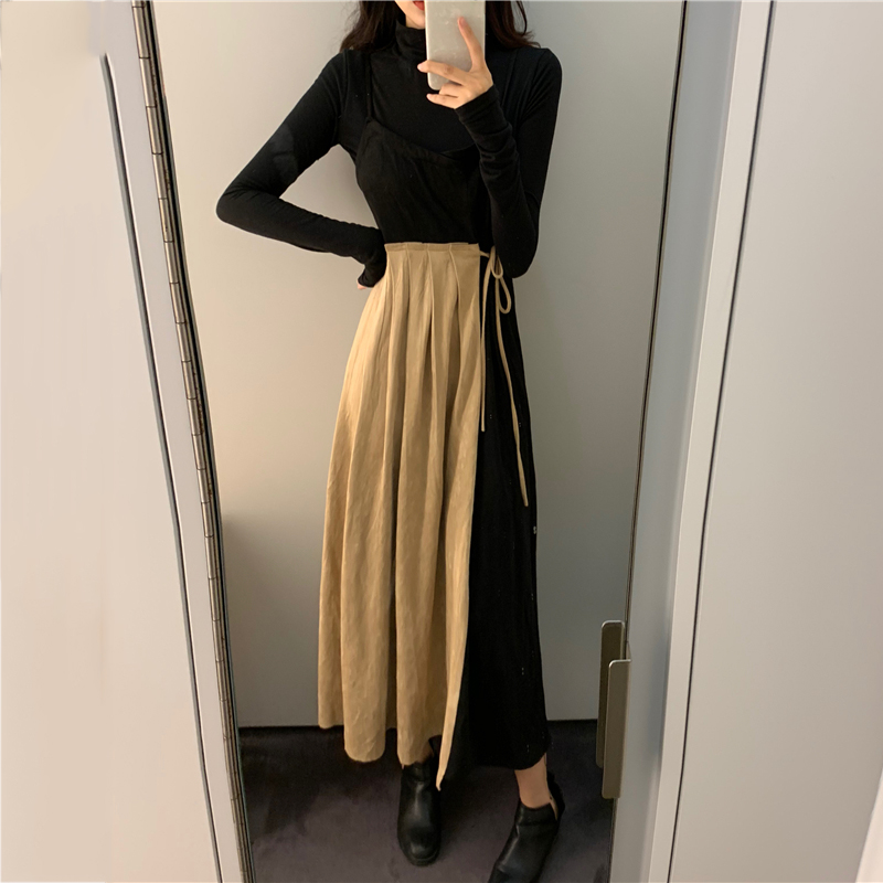 套裝女秋冬2018新款拼接V領中長吊帶連衣裙子修身長袖黑色T恤上衣