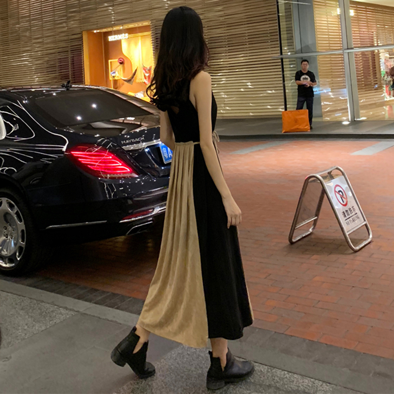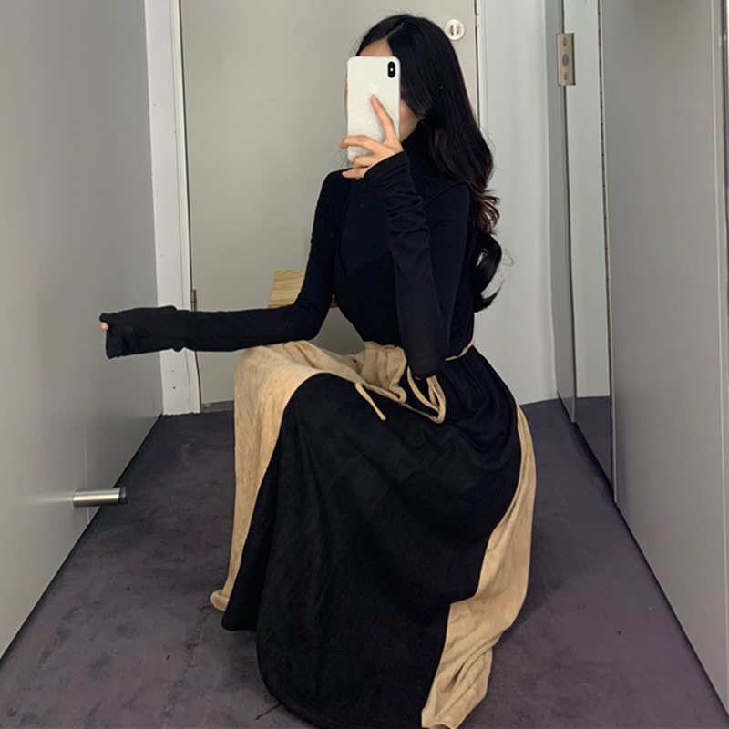 / 套裝女秋冬2018新款拼接V領中長吊帶連衣裙子修身長袖黑色T恤上衣