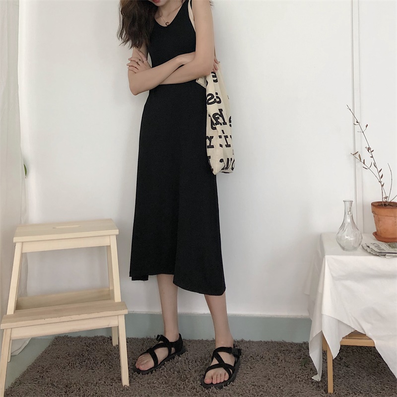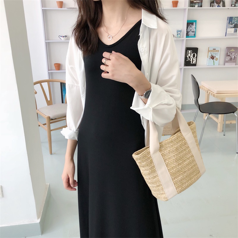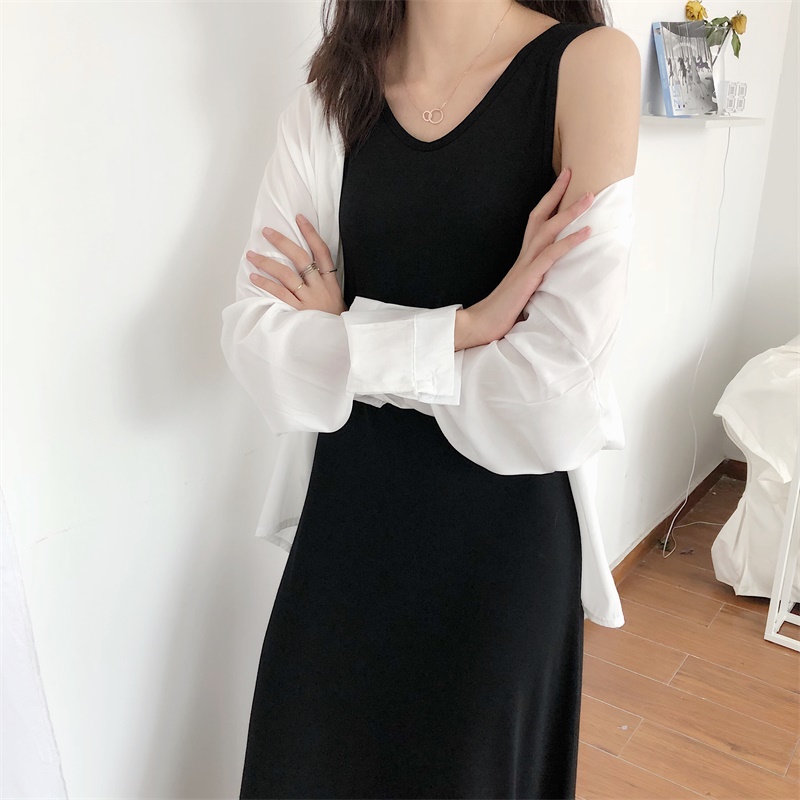 / 夏季韓版女裝簡約黑色顯瘦針織背心連衣裙+薄款白色防曬襯衣套裝