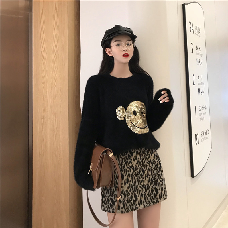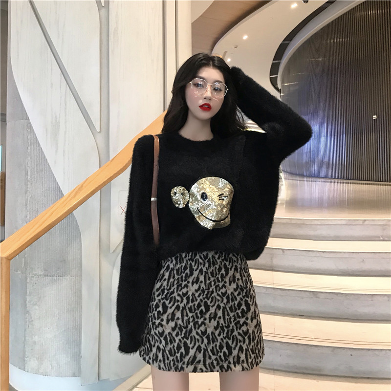 2018早秋針織衫女寬松慵懶黑色軟糯毛衣女毛絨絨圓領套頭笑臉上衣