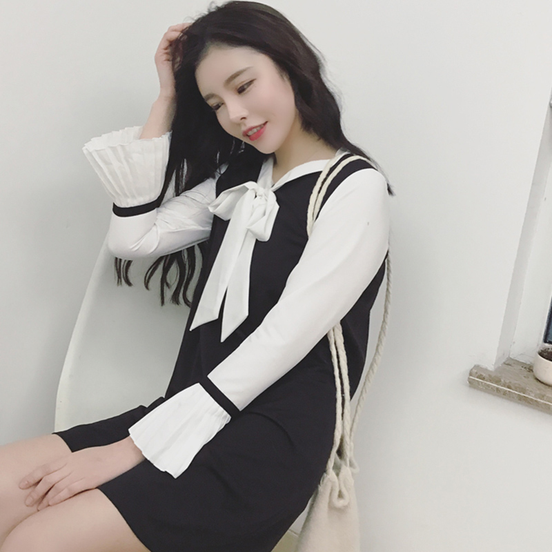 秋裝新款2018女港味假兩件少女系帶蝴蝶結黑白拼色喇叭袖連衣裙女