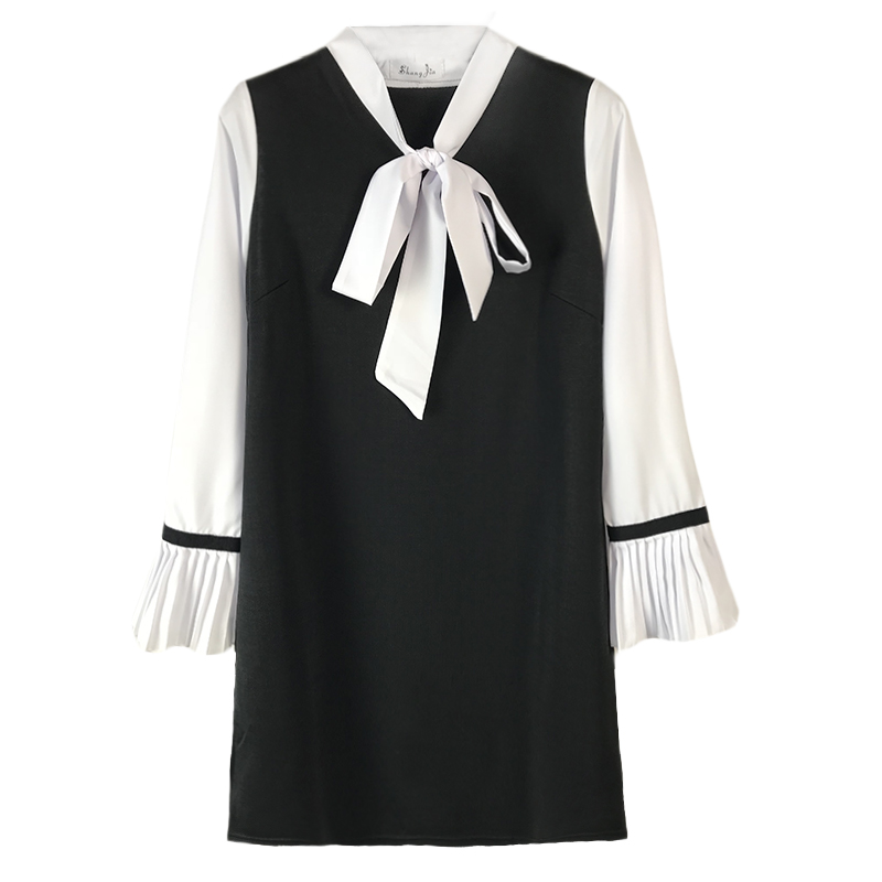 / 秋裝新款2018女港味假兩件少女系帶蝴蝶結黑白拼色喇叭袖連衣裙女