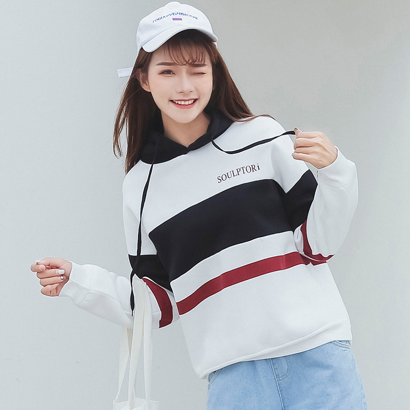 / 學院風長袖加絨衛衣女秋冬裝2018新款韓版百搭寬松拼色連帽外套潮