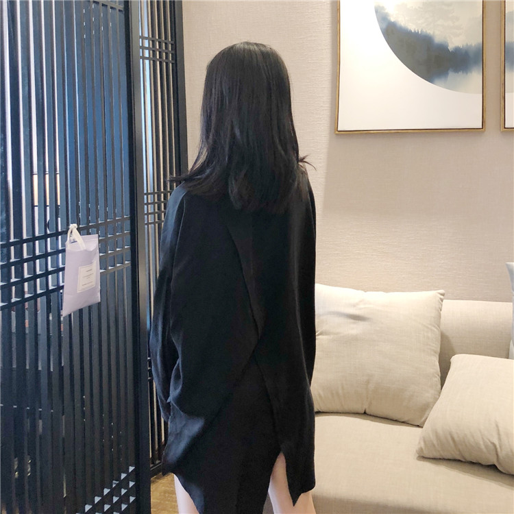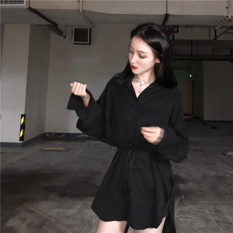 2018秋裝新款復古V領長袖襯衫慵懶風chic小清新中長款上衣送腰帶