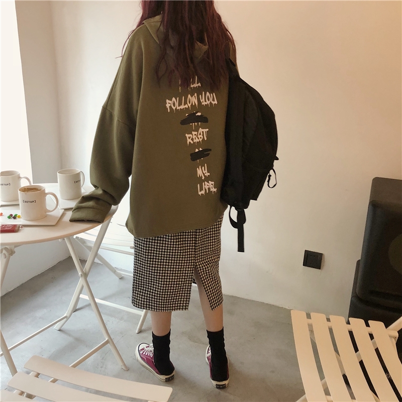 韓版時尚休閑套裝秋季女裝原宿風連帽加絨衛衣+格子半身裙兩件套