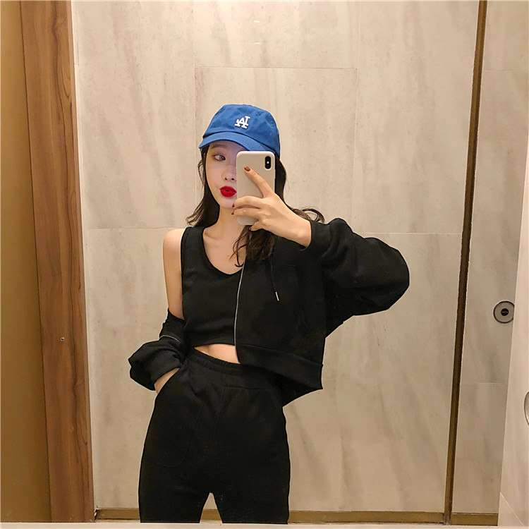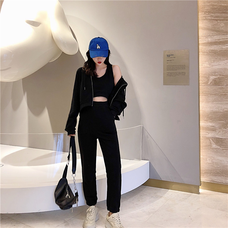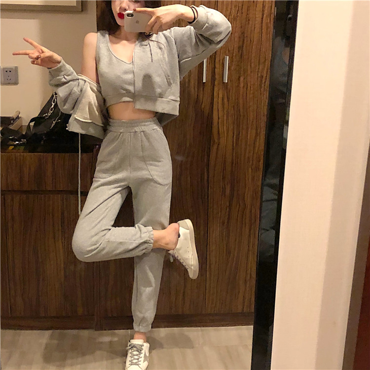 / 秋裝女2018新款純色開衫衛衣外套+內搭背心+休閑運動褲子三件套裝