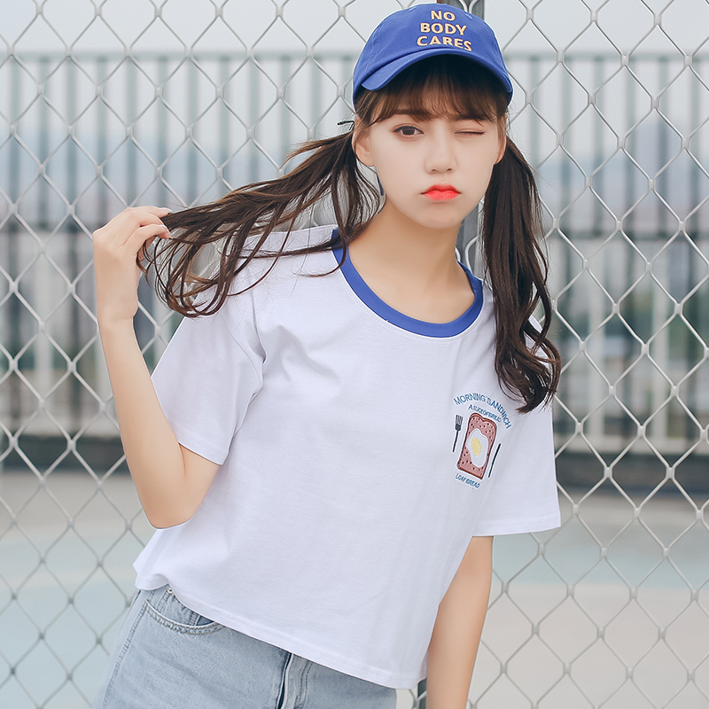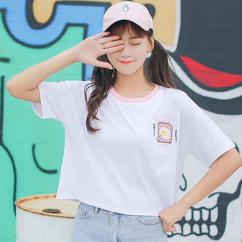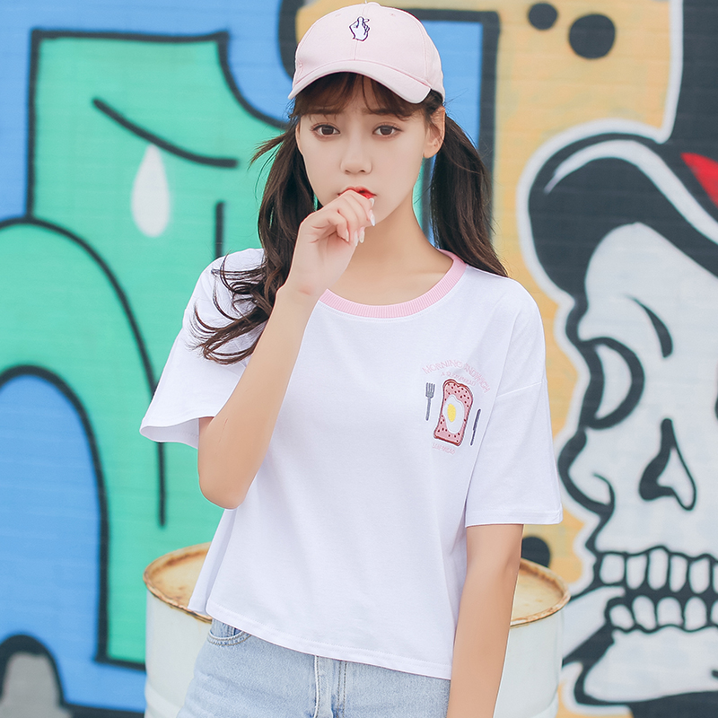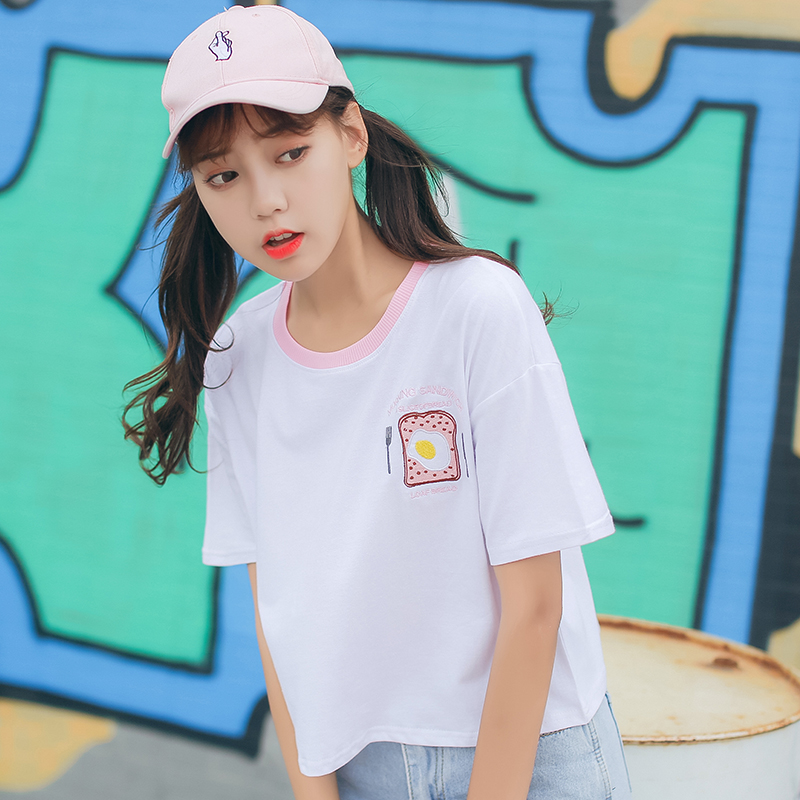 / 夏季女裝新款韓版顯瘦卡通煎蛋刺繡圓領短袖T恤學生白色休閑上衣