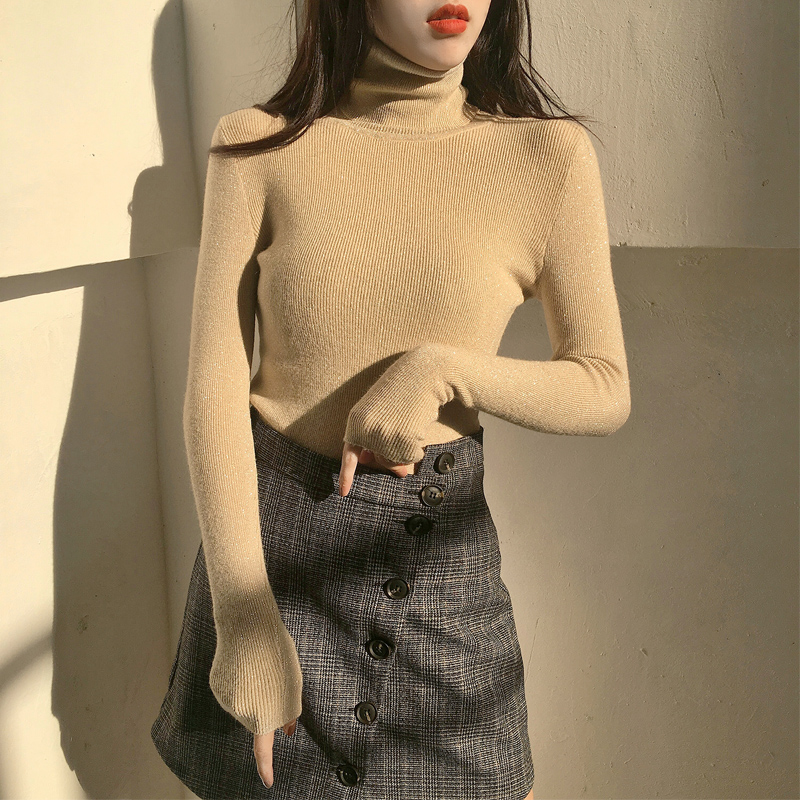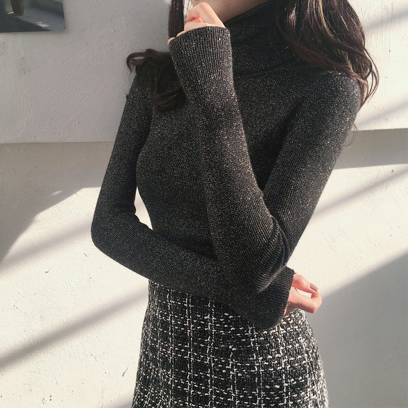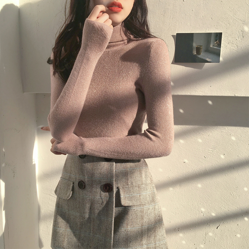 chic早秋毛衣慵懶風修身顯瘦高領亮絲針織衫女長袖毛衣打底上衣潮