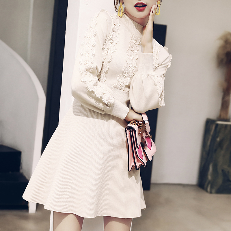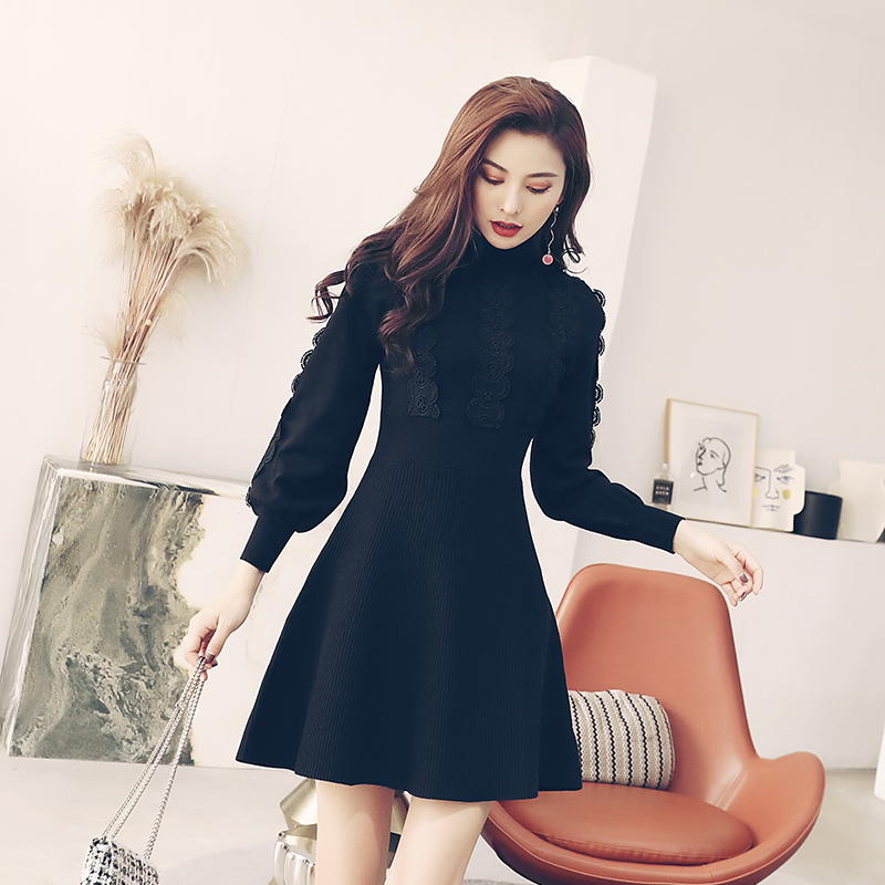 / 甜美氣質2018秋女裝裙新款針織半高領長袖氣質收腰純色高腰連衣裙