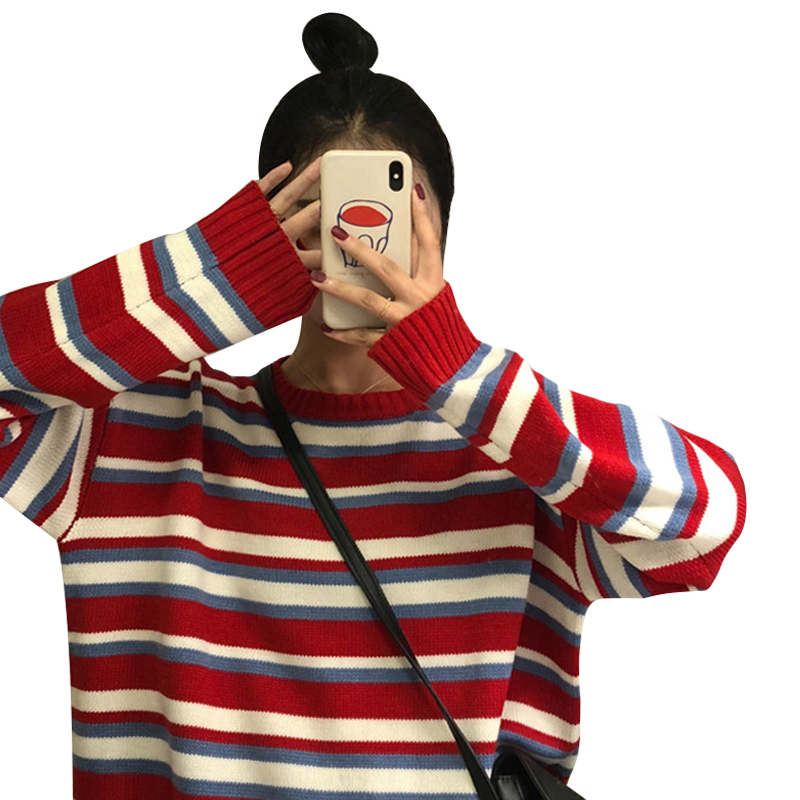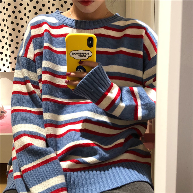 秋冬女裝韓版寬松復古慵懶風彩色條紋套頭超火毛衣針織衫上衣外套