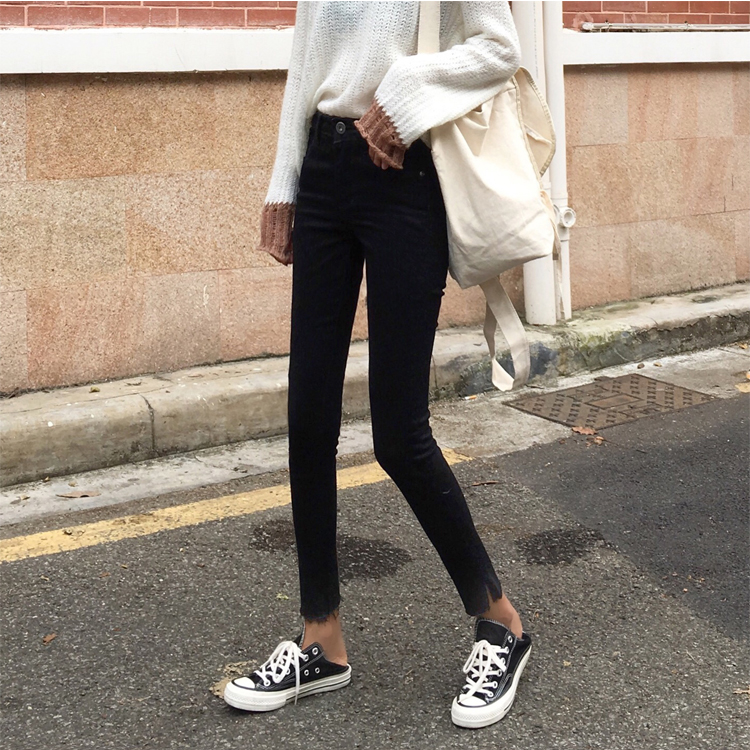 / 秋季韓版修身顯瘦開叉鉛筆褲黑色牛仔褲學生高腰小腳褲學生褲子女