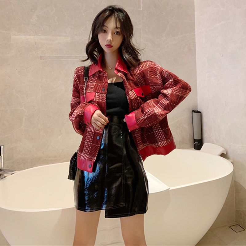 chic格子拼皮短款毛呢外套女秋冬裝2018新款寬松長袖流行呢子大衣